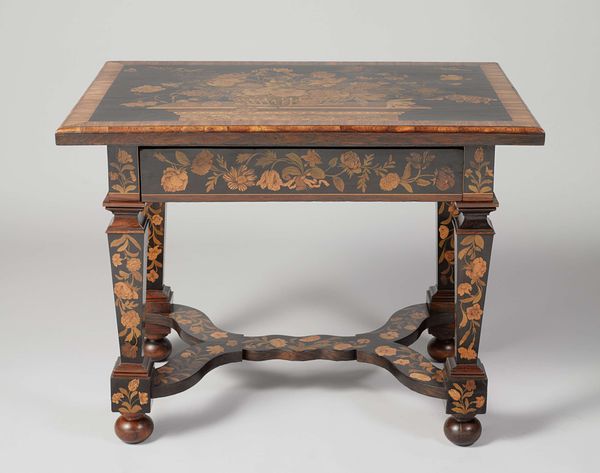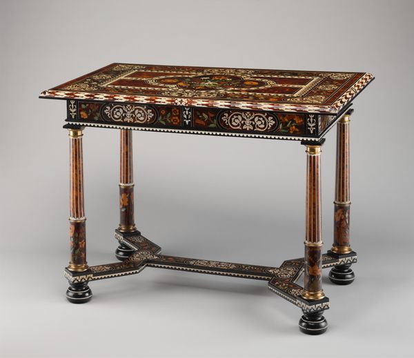 This table was made by Pieter de Loose. Its dimensions are 83.5 cm high, 145.0 cm wide, and 88.0 cm deep. Imagine this table placed in the home of a wealthy European family. We can feel the opulence of the baroque period, where artistry was not just about beauty but also about displaying one's status and power. This aesthetic was fueled by colonialism and the expansion of global trade, and the exploitation of labor and resources from colonized lands. The table is decorated with cherubs, ram heads, and floral garlands. The cherubs act as both decoration and symbol, representing innocence, divinity, and a connection to the classical past, a world in which male bodies were celebrated. This contrasts sharply with the realities of gender and class at the time, where access to beauty, education, and power was limited. This piece challenges us to consider whose stories are told through art and whose are left out.