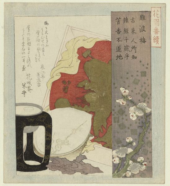 Curator: Let's turn our attention now to "Plum Blossoms from Osaka," a lovely woodblock print created by Totoya Hokkei in 1823. I'm drawn to its intimate scale. What's your first impression? Editor: Intimate, certainly. I notice that despite its delicate portrayal of nature, there’s almost an interior stillness to it. It’s like a stage setting, with the objects carefully placed as props, all hinting at something just beyond our view. Curator: Hokkei, deeply embedded in the artistic circles of his time, situated this piece within the vibrant ukiyo-e tradition, a movement deeply invested in depicting the fleeting pleasures and fashionable life of the Edo period. Prints like this weren't just art; they were reflections of and commodities within a burgeoning urban culture. Editor: Absolutely. Knowing this was created in a moment of relative peace and prosperity definitely changes how I look at it. The careful placement, the inclusion of poetry… it's all meant to cultivate a certain ideal, isn’t it? To project a sense of refinement and cultural status? And to whose benefit? Who was afforded this idealized vision? Curator: Indeed, Hokkei cleverly utilizes the conventions of the still life. Notice the meticulous detail in rendering the plum blossoms and the geometric background. It creates a kind of tension between the natural world and the manufactured. But even this tension has to be seen as reflecting socio-cultural values. Editor: Right, this contrast between natural forms and geometric pattern—a symbol of order—feels so central to this piece. I think the squares, while they appear as abstract adornment, symbolize social constraints on something as delicate as these cherry blossoms. It reminds me how the aestheticization of nature is always deeply tied to the social constructs and even power dynamics that underpin it. It's pretty to look at, but what else is at play? Curator: Exactly. Through careful visual analysis and historical understanding, Hokkei’s "Plum Blossoms from Osaka" invites a much richer dialogue about artistic practice. Editor: And it calls for an intersectional look at class and cultural production. Even a seemingly innocuous depiction of flowers contains layers of complex narratives that we can only start to access by contextualizing.