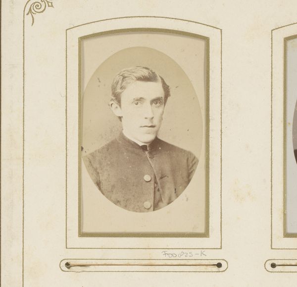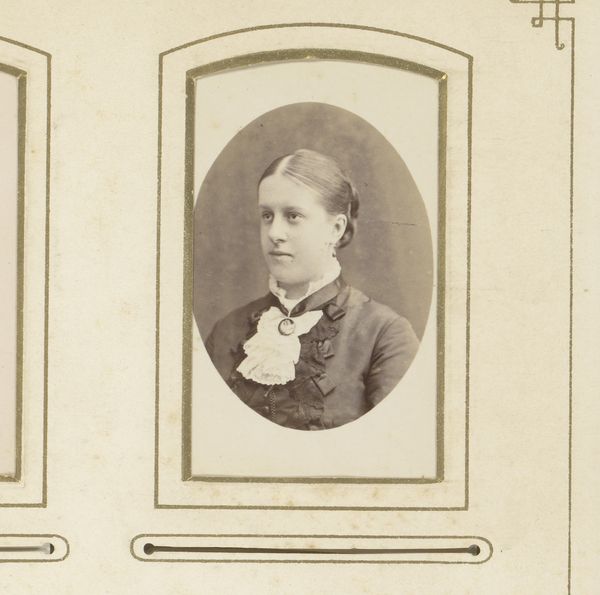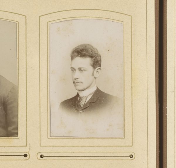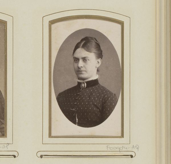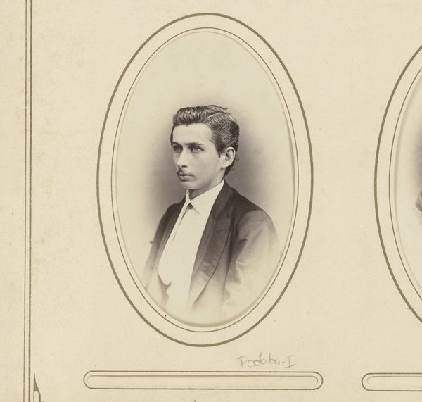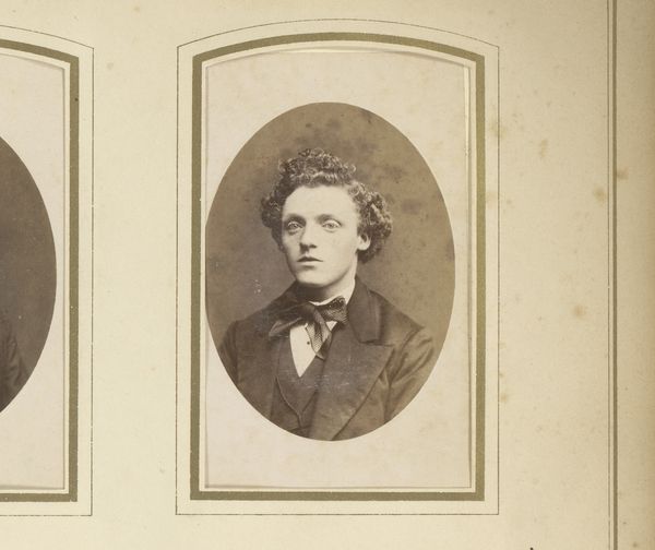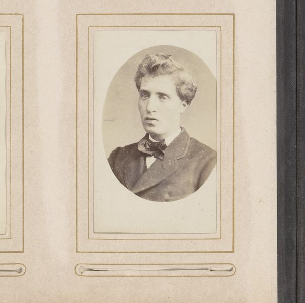 Editor: Here we have an albumen print entitled "Portret van een man met vlinderstrik," or "Portrait of a Man with a Bowtie" by Thomas Martin Staas, dating from around 1865 to 1895. It strikes me as quite formal, even a bit rigid in its composition. What do you see in this piece, considering its visual components? Curator: Immediately, the symmetry dominates: the oval frame, the man's pose, even the carefully arranged hair. Note how the subdued tonality emphasizes the stark contrast between the white shirt and dark jacket, drawing attention to the bowtie – a focal point and signifier of social convention. How does the choice of the oval frame, rather than a rectangle, affect your reading of the portrait? Editor: I hadn't really thought about the frame, but it softens the image somehow, makes it feel a bit less… severe? Curator: Precisely. The oval acts as a visual parenthesis, isolating the subject and creating a sense of intimacy. The use of albumen print – observe its delicate texture and subtle sheen – further contributes to this refined aesthetic. One could argue that the photographic medium itself plays a crucial role here. Does this contribute to the subject’s ‘realness’? Editor: I suppose it does. Unlike a painting, a photograph feels more…authentic? I mean, as a document. So, this combined with formal style really underlines the subject’s identity as an individual while framing him within a particular societal moment. Curator: An astute observation. We see not only an individual but also the constraints and expectations of his era manifested in the image's formal elements. This photograph uses medium and composition to convey very clear signals of class, personality, and presentation of the self. Editor: It's fascinating how much meaning is conveyed through these carefully chosen details and I wouldn’t have noticed those details if not pointed out, thanks. Curator: Indeed, attending to these elements allows the work to be fully expressed in the viewing process.