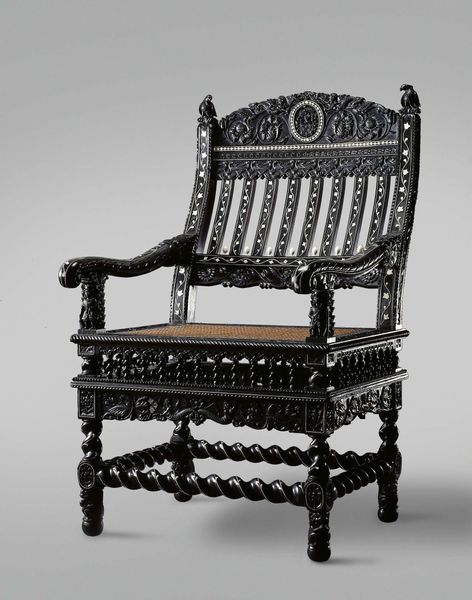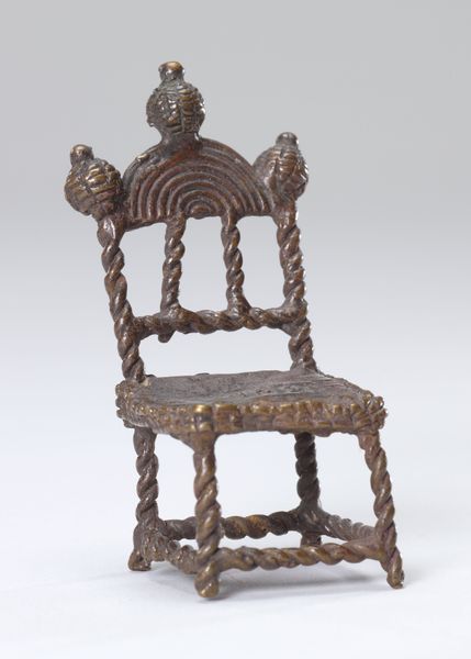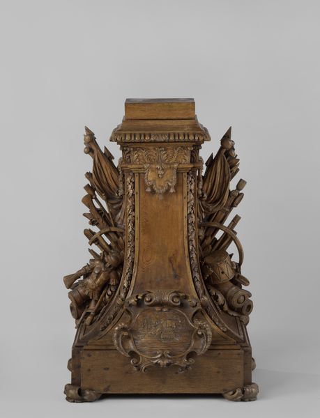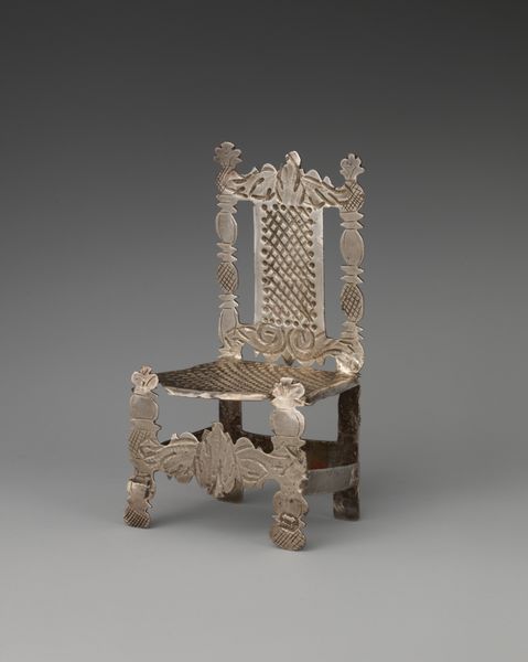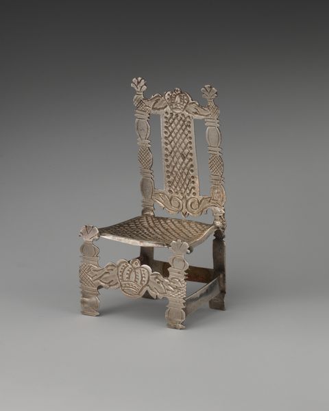 Editor: This object, a "Miniature Fireback" made of silver, dates from between 1685 and 1715. It’s currently housed at the Metropolitan Museum of Art. Its size and intricate details are quite charming, but its baroque design also seems formal and rigid. What structural elements strike you in this piece? Curator: The work exhibits a clear emphasis on symmetry and balanced ornamentation. Consider the vertical division of the fireback itself, flanked by identical scrolling motifs. Even the floral arrangement at the top is carefully organized around a central axis. Do you notice how the rigid geometry and detailed silverwork contribute to a sense of order and control? Editor: Yes, the meticulous craftsmanship and the mirrored patterns give it a very controlled feel. The floral designs and curvilinear forms do soften it a little. It feels like a study in contrasts, between structure and flourish. Curator: Precisely. Look closer at the materiality. Silver, with its reflective surface, adds to this dialogue of form and light. Observe how light interacts with the embossed floral designs. Are there certain formal or material relationships that stand out for you? Editor: I see now how the reflection off the silver exaggerates the dimensionality and depth of the fireback’s sculptural elements, adding to the ornamental nature of the overall structure. I suppose I had initially interpreted it more for its aesthetic function rather than structural composition. Curator: Indeed, analyzing how the materiality of an artwork relates to its structure offers new perspectives. Considering the interplay between form and surface quality ultimately deepens our understanding of its unique expressive capabilities. Editor: I will definitely view art objects in museums with new eyes now that I am more cognizant of structural qualities and the impact of material choices. Thank you for sharing these new perspectives!