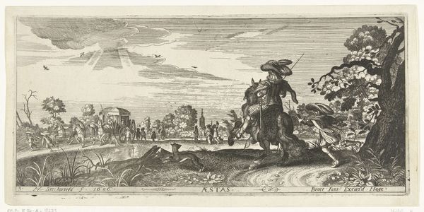 Stefano della Bella created this print, 'Port of Livorno with Statue of Ferdinand I,' using etching. The composition is a study in contrasts, oscillating between the micro and the macro, the individual and the collective. Notice how the detailed foreground, filled with bustling figures and maritime activity, gives way to a more expansive background dominated by the statue of Ferdinand I. This statue acts as a focal point, a vertical assertion amidst the horizontal sprawl of the port. The linear precision of the etching technique allows for a rich textural detail, from the rough stone of the docks to the billowing sails of the ships. Della Bella masterfully employs line and perspective to construct a space that is both inviting and imposing, reflecting the complex social and economic dynamics of a bustling port city. The print engages with themes of power and commerce, embodied in the statue and enacted in the lively scene below. It invites us to decode its intricate visual language and consider how the artist's choices reflect the cultural values of his time.