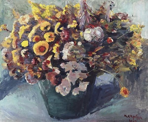 Editor: Here we have Martiros Sarian's "Roses," painted in 1949. It’s an oil painting, a vibrant still life. The way the thick paint is applied gives it such a tangible feel. What strikes you about it? Curator: Look at the density of the paint itself. Sarian wasn't just depicting roses; he was engaging with the very *stuff* of paint. Consider the context of 1949. Post-war, resources were often scarce. Was Sarian perhaps commenting on luxury versus necessity, using a traditionally 'feminine' subject like flowers? Editor: That’s a really interesting point I never considered. So, you're suggesting that the choice of such a thick application of paint could have symbolic weight? Curator: Absolutely. Think about the labor involved. The visible brushstrokes, the sheer volume of oil paint used when others might have been rationing… it all contributes to a statement. How accessible would these materials have been to the average artist, and what does that say about artistic privilege, even in the Soviet context? Editor: So, it is a sign of artistic privilage as the war just ended a few years earlier, as resources for regular people would be hard to obtain, while Sarian was making art from them? Curator: Exactly. Consider who had access to the means of production - paint, canvas, studio space - and what kinds of stories those material conditions allow them to tell. This isn't just about the beautiful flowers; it's about the power dynamics embedded in artistic creation. How does that perspective change how you see the artwork? Editor: It adds a whole new layer. I was initially drawn to the beauty, but now I see it's also a product of a specific time and set of social circumstances related to who and how the artist produced the work using material only available for few. Thank you! Curator: Indeed. Examining the material conditions gives us deeper insights into the art's message and the artist's place in the world.