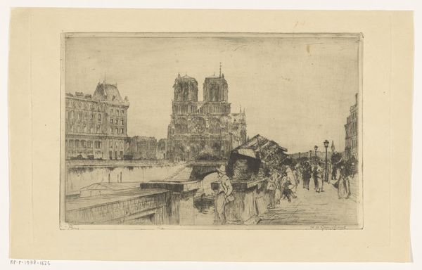 Curator: Let’s discuss Charles Meryon’s "The Apse of Notre-Dame, Paris," an etching made sometime between 1847 and 1859, now housed at the Metropolitan Museum of Art. Editor: It has an unfinished quality that I find really appealing. It looks more like a preliminary sketch than a finalized print, yet the cathedral is rendered with astonishing precision. Curator: Well, Meryon made preparatory drawings, many in pencil, and transferred the designs to the copper plate before etching. What interests me is the industrial reality behind the artwork; the very paper and ink used reflect broader issues of accessibility, consumption, and labor in 19th century printmaking. Editor: I understand, but what I notice is the interplay between line and space; Meryon’s mastery in depicting depth and texture, all created through meticulously etched lines and varied tone. Curator: Certainly. The industrial reproduction makes it widely available to different economic layers, turning Notre Dame, with its architectural grandeur, into a commodity, one that could circulate widely throughout French society and beyond. Editor: And while its mass production allowed the subject of this artwork, Notre-Dame, to circulate widely, it still focuses attention on details of form and light, creating a dramatic and emotionally stirring composition. There's a poetic element here, almost romantic with the sublime spires of the cathedral contrasting with the more mundane activity around it. Curator: Precisely, this speaks volumes of 19th-century society; cathedrals are reduced to items within commercial trade, blurring boundaries between the sacred and profane, but on the level of individual consumption. Editor: Looking at the artwork again, it's evident how Meryon used a simple etching technique to express a deep emotional response to this architectural marvel. I appreciate its subtle power, its structural beauty. Curator: Indeed, but it’s a product of its time: an urbanizing world transforming landmarks into market commodities through new reproductive technology. The architecture interacts with materials; a product of consumption. Editor: I see your perspective; materials shaping social reality! Meryon has provided much to ponder. Curator: Indeed, a compelling example of art embedded in and shaped by complex processes.