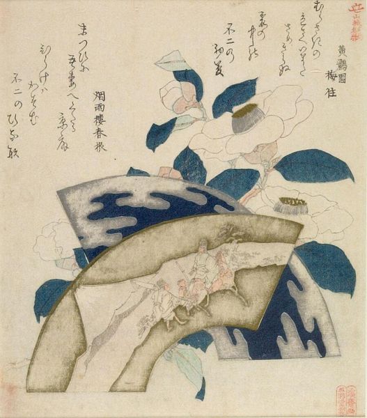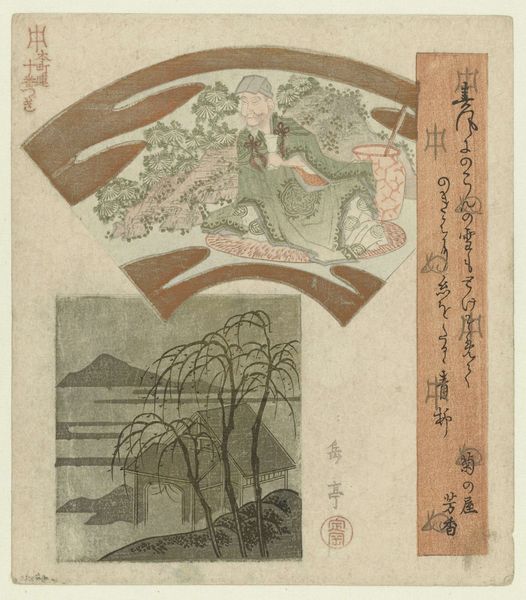 Editor: This print, by Yashima Gakutei, features Tao Yuanming and a Chinese landscape. The fan shape and muted colors give it a nostalgic feel. What symbols stand out to you in this image? Curator: Note how the fan shape itself frames the scholar, referencing leisure and refined taste. What does the wine jar suggest to you about Tao Yuanming's character? Editor: Perhaps his retreat from public life and embrace of simplicity? Curator: Precisely. And see how the lower panel contrasts that with a starker, more grounded scene. These opposing images mirror the artist’s inner world. Editor: I didn’t consider how the two images could be in dialogue. Thanks for illuminating that for me.
