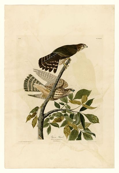 Editor: This print, possibly from 1754, is called "The Red Winged Starling" by Mark Catesby. It seems to be done in watercolor, pencil and possibly other printmaking techniques. The red and yellow "epaulettes" really pop out at you. What do you see in this piece? Curator: Well, first, let's observe the formal elements. Notice how Catesby uses line to meticulously define the bird's feathers and the leaves. The contrast between the stark black of the bird and the muted greens of the foliage creates a visually arresting composition, wouldn't you agree? How does that striking color contrast strike you? Editor: Yes, the sharp contrast is very eye-catching, and makes it a very dynamic composition! It also highlights how important those colours of the Starling's wing markings must be. The level of detail seems pretty special too, almost hyper-realistic for a watercolour, but do you think that it distracts the viewer away from some greater idea? Curator: Not at all! That level of realism speaks directly to the function and intrinsic quality of the work as scientific illustration. This is not just art for art's sake, but also scientific documentation. Consider the work's emphasis on shape, form, and precise representation. Does it serve a purpose beyond mere aesthetics? How is it successful in fulfilling its illustrative function? Editor: Ah, I see. So the details aren't just decorative, they are informative. It becomes less about the symbolic and more about the exact representation of the physical world? That gives a new perspective! Curator: Precisely! By stripping away layers of meaning beyond that within the piece itself, we may truly appreciate the intrinsic elements of colour, line, and form as vehicles for communicating scientific observation. So much detail can show an artist's purpose! Editor: Thanks, that’s a useful viewpoint and an intriguing perspective to keep in mind!