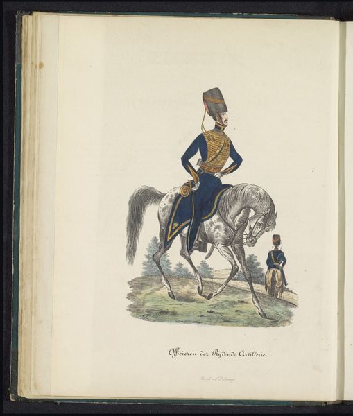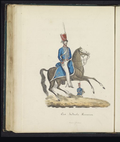 Editor: This is a drawing titled "Uniform van de officieren van de jagers van het Limburgs Bondscontingent, 1845," created by Louis Salomon Leman using colored pencil and other media. I find the level of detail fascinating; how were such precise lines achieved with colored pencils back then? What’s your perspective on this piece? Curator: It's intriguing to consider the societal context of this image in relation to its production. Notice the precise rendering of the uniform, down to each button and braid. The materials and labor involved in creating such a detailed depiction, likely commissioned, speak to the social and economic status both of the depicted officer and the artist themselves. Who do you think it was intended to represent? Editor: It does seem aimed at displaying status, maybe for family or military records? The emphasis is clearly on the uniform, the quality of the paper, the precision of the line work… the whole presentation speaks to something beyond a simple sketch. How would it differ, as a piece of art, if created on readily available materials? Curator: Exactly! If created on cheap paper, mass produced or even hastily done, the piece would completely lose its elevated status, reducing it to a mere image of an officer instead of functioning as a status marker. Considering the societal role of military uniforms then—hand-stitched, regulated materials, signifying power—the drawing acts as a record of a system, a hierarchy visualized through meticulously crafted material objects. Even the choice of colored pencil over, say, charcoal, changes its function and interpretation. What does that materiality tell you? Editor: I see what you mean. It is more than just a picture; the drawing and materials themselves communicate about class, labor and hierarchy. Thinking about the piece this way reveals more about 19th-century social structures than I initially realized. Curator: Indeed. Examining art through its materials and the means of its production reveals deeper meanings and cultural values.