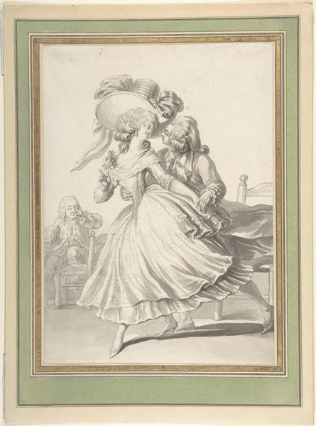 Editor: Here we have Louis Philibert Debucourt's "Le Coup de Vent," created between 1775 and 1832. It’s a print, etching, and drawing all in one, and quite humorous. What symbols or social cues are jumping out to you? Curator: The entire scene screams "social disruption." Notice how the wind, the literal "coup de vent," becomes a metaphor. Consider the umbrella: not just protection from the elements, but also a symbol of status. Now struggling against the wind, it signifies the challenges to social stability of the time. Editor: Interesting. The figures themselves seem to be battling the wind, literally and perhaps figuratively, if the umbrella is about status. Curator: Exactly! Look at the woman's clinging dress, the flying hat...clothing articles become markers of identity tossed about. Think of the French Revolution brewing at the time, a period where traditional hierarchies were challenged. This "wind" isn't just meteorological. What emotional reverberations do you see? Editor: I suppose the expressions could be interpreted that way, too: the woman's anxious gaze seems to mirror broader anxieties during a turbulent historical time. The man looks cross, even defiant. Curator: And he's desperately trying to retain control, isn't he? The way he grips the umbrella, facing directly into the storm, shows resistance against an unmanageable shift. What does that defiant expression bring to your mind? Editor: Well, the fact that it’s a caricature says it all…maybe an echo of resistance to change? I’m definitely seeing the print in a new, socio-political light now. Curator: Indeed. "Le Coup de Vent" captures more than just a gust of wind; it’s an insightful and humorous visual commentary on a society grappling with change. Editor: Definitely, thanks for helping me understand how clothing can signify larger social anxieties that were up in the air!
