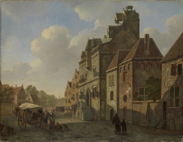 Editor: This is Jacob Vrel's "View of a Town," painted between 1654 and 1662 using oil paint. The muted color palette makes it feel quite solemn and still, doesn't it? What stands out to you from a formalist perspective? Curator: The architectural forms define the space. Observe the strong diagonals created by the converging rooftops and the contrasting vertical lines of the windows and doorways. The composition is structured to draw the eye towards the background figures. The impasto on the brickwork gives it a certain tactile quality, doesn't it? Editor: It does, the texture seems quite intentional! What about the positioning of the figures, could that have a deeper meaning? Curator: Perhaps, but let's look closer at the interplay between light and shadow. The placement creates visual rhythm that guides our eye around the canvas. How does the use of chiaroscuro influence your perception of depth and form? Editor: The subtle gradations certainly enhance the sense of realism, emphasizing the three-dimensionality of the buildings and the figures. It creates such depth. Curator: Exactly. The brushstrokes, too, aren't haphazard. There's a distinctness that defines the architectural details while rendering the human subjects with greater subtlety, thereby underscoring their status as denizens of the streetscape rather than individual portraits. Editor: I see how the lack of individualization keeps focus on the spatial qualities. Thank you; it gives a different perspective for thinking about historical painting beyond subject and symbolism. Curator: Indeed, by analyzing formal structures, we can deepen our experience of this work. Focusing on those components offers unique interpretive insight.