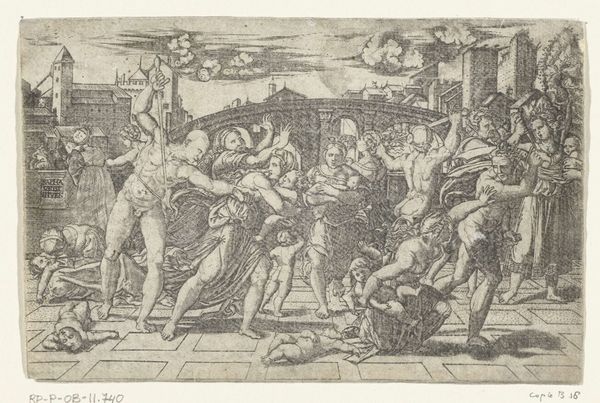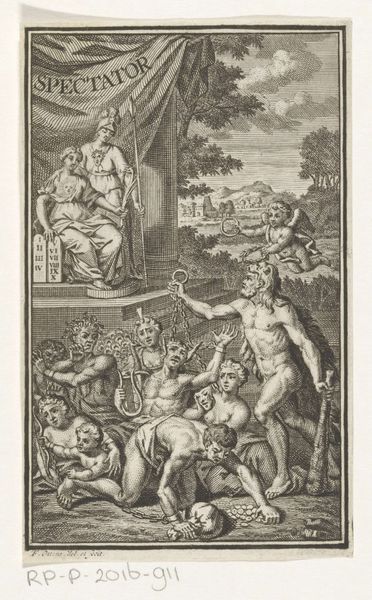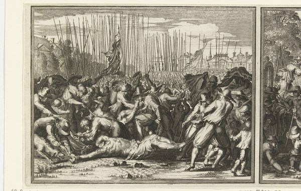 Curator: At first glance, the overall impression of the print is one of tightly packed, dynamic chaos, heightened by a rather uniform tone across the picture plane. Editor: Today, we are observing "Romans Bringing Various Offerings", an engraving made in 1672 by Romeyn de Hooghe, now residing here at the Rijksmuseum. The historical context behind de Hooghe's piece provides a significant entry point to interpreting its complex narrative. During the Dutch Golden Age, such images not only depicted historical or mythological scenes but also served as political allegories, often reflecting on contemporary events and power structures. Curator: Focusing on form, consider how the artist utilized line to differentiate textures. We see fine, parallel lines create the smooth drape of fabrics, while short, erratic strokes build the rugged texture of animal fur. There’s a compelling juxtaposition of detail and density across the composition. Editor: Indeed. Look at the way the ritualistic sacrifice is depicted, with the focus on wealth, the dead animal, and enslaved people at the foot of the imperial shrine. De Hooghe comments on the cost of imperialism, of wealth being built at the expense of subjugated bodies, in war, labor, and religious subjugation. Curator: I'm drawn to how De Hooghe creates spatial depth. Notice the tiered arrangement, moving from the chaotic foreground of sacrificial animals to the structured elevation of the figures and architecture behind. There's a palpable contrast between the earthly sacrifice and the idealized figures. Editor: And considering the date of its creation, it is important to contextualize it within the history of Dutch imperialism, thinking about how these kinds of images functioned in the history of ideas. In the context of contemporary theory, it’s essential to acknowledge how art can be both a product and a perpetuator of colonial ideologies. Curator: A fascinating piece offering, I think, different avenues for understanding through careful analysis of the image itself. Editor: Absolutely. De Hooghe gives us a window into the complex intersections of power, sacrifice, and representation during a critical juncture in European history.
