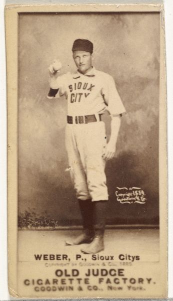 This baseball card of Elton P. "Ice Box" Chamberlain, Pitcher, St. Louis Browns, was produced around 1889 by Goodwin & Company as part of the Old Judge Cigarettes series. The sepia-toned photograph captures Chamberlain in a poised stance, ready to pitch, with the word "LOUIS" emblazoned across his chest. The composition of the image is carefully constructed, balancing the figure of Chamberlain against the blurred background. The artist uses sepia to achieve a certain level of tonality, emphasizing the texture of the clothing and the grit of the baseball field. In terms of semiotics, Chamberlain's image functions as a signifier of athleticism, American culture, and the burgeoning commercialization of sports through advertising. Yet, the muted tones and carefully posed stance also evoke a sense of nostalgia, rooting the image in its historical context. The photograph serves as a cultural artifact, encapsulating the intersection of sports, commerce, and visual representation in late 19th-century America.