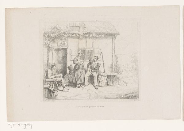 Curator: Here we have "Six Children Playing Soldiers," a print made by Nicolas Toussaint Charlet around 1837. What leaps out at you about this piece? Editor: Immediately, there's a fragility in the pencil work itself—almost a whisper of war, a child’s fantasy played out with charcoal smudges and the barest suggestions of form. It’s tentative. Curator: Absolutely, a fragile fantasy. You see the rudimentary 'weapons,' the cobbled-together costumes. Consider the paper and pencil, readily available, affordable – tools of democratic expression during a time of considerable social change. Editor: Exactly. The accessibility of printmaking allowed images like these to circulate widely, shaping popular notions of patriotism, childhood, and even the glorification of military life for a broad audience. The child dressed up at the first of the line in dark pencil tone inspires in the viewer ideas about identity, maybe also role model. Curator: It is fascinating, isn’t it, the way the ‘materials’ shape the narrative. And yet, something about their game feels innocent despite its subject, don't you agree? Perhaps a world viewed through younger, more naive eyes. Editor: Well, childhood "innocence" is a loaded term. Think of what they might be internalizing: Power structures, the valorization of conflict. Even the *act* of mimicking soldiers normalizes it. The medium lends to the theme, like paper lends itself to war orders or communiques from far away locations, brought back home. Curator: That is a really relevant perspective, and indeed gives pause to how social messaging may be shaped at early age through imitation, play. Almost as if their small bodies serve as malleable instruments, open for indoctrination. But maybe Charlet also wanted us to question such militaristic ambition, showing war through the imaginative space of a child? Editor: That's an interesting proposal; to imagine him suggesting his audience reflect. He shows children playing but in playing they reflect the zeitgeist that affects every part of daily life, in his use of pencil on paper that is replicated and consumed by a society hungry for art, culture, entertainment, or propaganda. Curator: Well, it's a work that resonates on multiple levels, layers like pencil marks. Each reveals new depths depending on how you are looking. It's good to know there are works here, where both adults and children can still engage. Editor: It makes one ponder the materials in front of us every day, too. How they become imbued with stories, with messages. The everyday and seemingly insignificant is very rarely without some type of societal undertone.