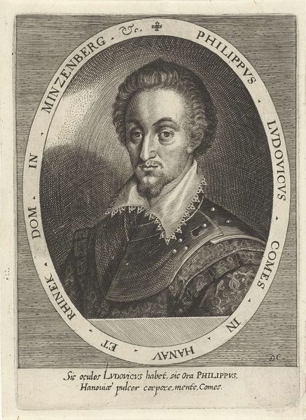 Editor: Here we have a 17th-century engraving from an unknown artist, titled "Portret van Frederik Hendrik, prins van Oranje, op 18-jarige leeftijd", or "Portrait of Frederick Henry, Prince of Orange, at the age of 18," at the Rijksmuseum. The formality is striking; I find myself wondering, what was it like to be a prince at that age? What do you see in this piece? Curator: It tickles me how these early portraits so desperately wanted to convey power, didn't they? Here's young Frederik, practically drowning in his armor, yet there’s also a naiveté in his face, almost as if he’s borrowing someone else’s gravitas. This work reminds us that the idea of ‘image’ has always been a performance, and the baroque style amps up the theatricality beautifully. Editor: That’s a fascinating point. It almost feels like he is playing dress-up. The floral decoration of his armour stands out – does that symbolise anything? Curator: Indeed. The flora intertwined on his armour, against the rigid, combative gear, speaks of desired virtues in a leader: Strength intertwined with prosperity. But it's an early etching – this detail also showcases the technical skill required at the time to create such elaborate designs, as if saying, "We can control and beautify anything." I bet this piece served almost as propaganda. What does the format communicate, would you say? Editor: Hmmm… by depicting Frederik in an oval frame surrounded by text, the composition gives the sense of a classical coin or medallion. So it immortalizes him, almost like a ruler from ancient history! It's clever how this work's many dimensions reveal how people crafted identities centuries ago. Curator: Exactly! Each element contributes, making you realize, just how staged it all was. That's what truly amuses and intrigues me.