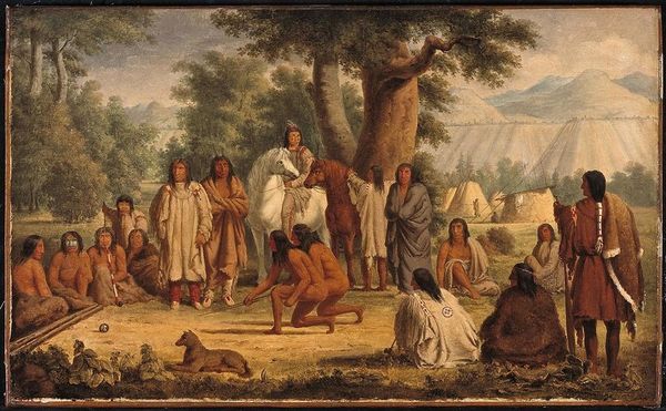 Editor: This is Paul Kane’s “Medicine Pipe Stem Dance,” painted in 1848 using oil paint. It's a captivating scene, and there's something about the muted tones that creates a solemn mood. What stands out to you in this work? Curator: Well, the painting presents an idealized, romanticized vision of Indigenous life during a period of immense change and disruption. Kane documented what he saw on his travels, but his artistic choices were always shaped by prevailing attitudes of the time and, of course, by the market. Editor: Can you elaborate? Curator: Absolutely. Consider the "authenticity" being presented here. Kane, like many artists of his era, played a role in constructing an image of the "noble savage" for a European audience, conveniently ignoring or downplaying the impact of colonialism, disease, and displacement that were actively transforming Indigenous societies. Does it strike you as problematic to be viewing such imagery? Editor: It does, actually. So, you’re suggesting that paintings like this one weren't simply objective records of events? Curator: Precisely. They were products of a specific cultural and political context. These paintings can tell us as much about the culture of the colonizers and their perceptions of the "other" as about the Indigenous peoples themselves. It’s important to consider who this image was created for, and the narrative it served to reinforce. Editor: That definitely changes how I see the artwork. I’m now thinking about the artist’s choices and how they might distort the truth. Curator: Precisely. Remember that the power to represent a culture holds significant sway and impacts our historical understanding of it. Editor: I’ll definitely keep that in mind moving forward. This was incredibly insightful.