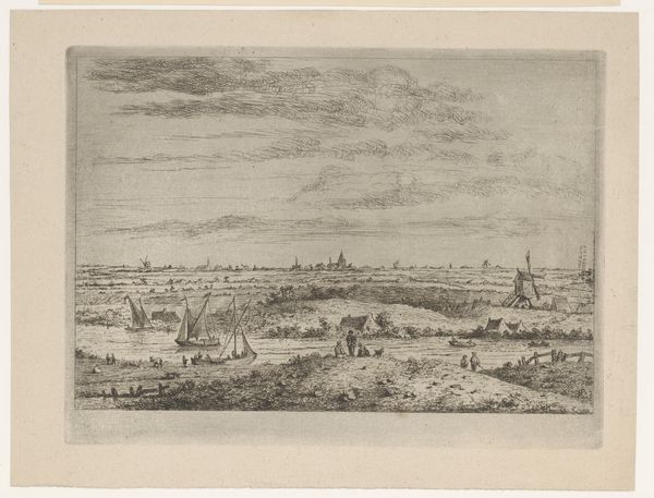 This is Rembrandt van Rijn’s "View of Amsterdam", an etching. The composition is dominated by a vast sky, giving way to a low-lying cityscape. Notice how Rembrandt uses delicate, almost ethereal lines to capture Amsterdam's skyline, punctuated by the iconic windmills and church spires. The foreground consists of a textured landscape. The lines are economical yet evocative. Rembrandt suggests depth and space through variations in line weight and density. The intricate network of lines creates a sense of atmospheric perspective, pulling the viewer into the scene. The horizon line, so low and unassuming, becomes a stage upon which the drama of the sky unfolds. Rembrandt’s mastery lies in his ability to transform a simple scene into a study of light, space, and human presence. It is a study of how we perceive and construct our reality.