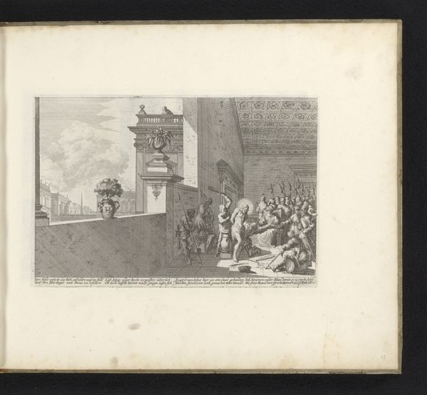 Editor: Here we have Melchior Küsel's "Berouw van Judas," created sometime between 1670 and 1682. It's an engraving, so ink on paper, depicting a dramatic scene with many figures around a grand doorway. There is something theatrical about the whole composition. What do you see in this piece, beyond the immediate subject matter? Curator: This engraving allows us to delve into the intersection of religious narrative, social commentary, and artistic expression within 17th-century Europe. The figure of Judas, fraught with guilt and remorse, becomes a lens through which we can examine concepts of betrayal, repentance, and divine forgiveness. Consider, too, the way the architectural setting amplifies Judas's internal conflict, representing the weight of societal judgment bearing down upon him. How might the cityscape visible through the doorway function symbolically? Editor: It gives the sense of a whole society judging him. Are you suggesting Küsel is commenting on the social pressures around religious morality? Curator: Precisely! The engraving invites viewers to contemplate the complexities of human action within a specific religious and socio-political framework. Küsel’s choice of medium – the relatively accessible print – suggests a desire to disseminate these ideas widely. We have to ask ourselves, what kind of dialogue might this artwork have sparked within its original context? Editor: So it's not just a religious scene, but a commentary on society and its values, widely distributed to encourage conversation. I had not considered that the artist had specific intent with the medium, either. Thank you. Curator: Indeed. And in reflecting on the historical context, we gain a deeper appreciation of the visual culture of the Baroque era. The use of engravings such as these offer insights into how social and philosophical dialogues were advanced through artistic creation. Editor: I hadn't fully appreciated how an artwork of this era reflects both religious conviction and sharp societal critique. Thanks for this.