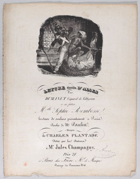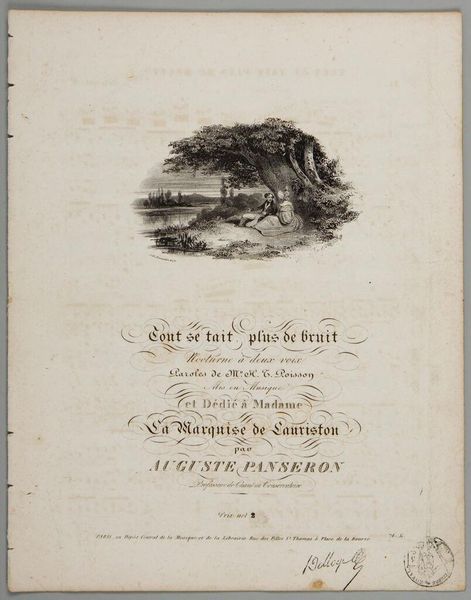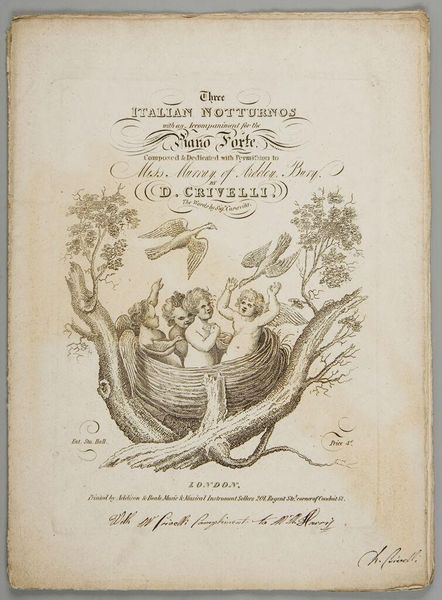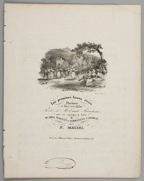 Curator: This sheet music, titled "The Return of the Month of May," features a delicate scene. It's unsigned, currently held at the Harvard Art Museums. Editor: It feels so… idyllic. Like a nostalgic dream of springtime festivities, a group dancing under a tree. Curator: May celebrations are an ancient tradition, linked to fertility and rebirth. The dancing, the music... it's all symbolic of renewal. Look at the print, a relatively inexpensive medium, making this celebration accessible to a wider public. Editor: You can almost feel the paper's texture, the labor involved in its production and printing, conveying a sense of shared cultural experience. Curator: Exactly. It's not just about the image, but about the entire cultural moment captured and circulated. Editor: It's interesting to consider how such a simple image can carry so much cultural weight, from ancient rituals to the rise of print culture.