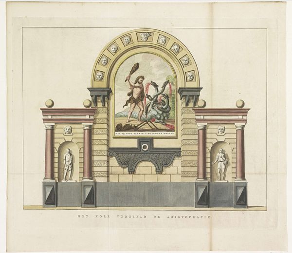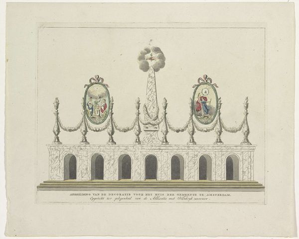This undated drawing shows the painted decoration in the Botermarkt in 1795. The anonymous artist used ink and watercolour to represent a building of sorts, displaying neoclassical architectural elements and iconography related to the Batavian Revolution. Visually, the work is structured around a symmetrical arrangement. Side pavilions flank a central structure, creating a balanced, almost ceremonial presence. The muted palette of ochres, reds, and greys evokes a sense of solemnity appropriate for a revolutionary context. The detailed rendering of architectural components—columns, arches, and statues—suggests an effort to legitimize the revolutionary fervor through associations with established classical forms. The work destabilizes traditional notions of power and authority. By invoking classical imagery while celebrating the destruction of the old constitution, the piece engages in a semiotic dance. Here, the visual vocabulary of tradition is employed to advocate for radical change. The subtle use of watercolor washes emphasizes the underlying tensions, making the work not just a historical document but also a complex statement on revolution, representation, and the reinvention of cultural values.