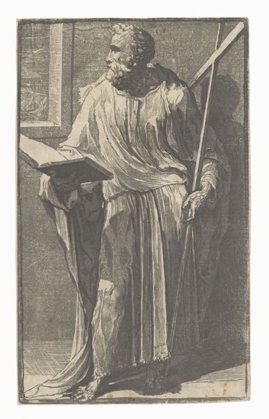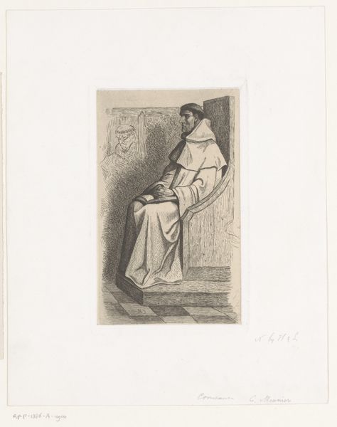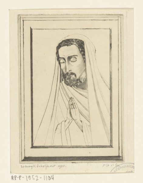 Curator: "Biddende man," or "Praying Man," an engraving by Lodewijk Schelfhout from 1926. It resides here at the Rijksmuseum. What are your first impressions? Editor: Striking, it has such a melancholic and serious tone. I am captivated by the contrasts Schelfhout creates with a fairly limited use of shading. The image, in terms of composition, appears divided, stark contrasts that emphasize isolation and the supplicant's individual plight. Curator: Interesting, that division echoes larger societal fissures that concerned Schelfhout. Remember, the early 20th century saw a great reckoning in traditional values and a rise of social awareness movements. Editor: How so? The work’s structure creates an incredible interplay of light and shadow. The contrast heightens the solemnity of the moment depicted. Note the precise, controlled lines of the engraving. This meticulous execution lends itself to contemplation and solemnity, and further focuses on formal analysis. Curator: Agreed. Schelfhout was deeply invested in the rise of secular ethics questioning established religions in his own lifetime, influenced by the shift away from purely religious societies to societies wrestling with their religious history and values. Editor: That said, don't you find the almost hyper-realistic portrayal, the meticulous rendering of textures – the fabric, the skin – strangely disquieting when framed within the context of an artistic religious vision? It nearly resembles photorealism and the man praying possesses, rather, human emotions of stress, which does a successful job making the sacred more common, more available for understanding by society. Curator: Indeed, through the figure of this kneeling man, rendered with such care, the work underscores that the act of devotion could belong to anyone. That, too, is quite powerful, turning it on its head in many ways. Editor: The manipulation of the technique, then, has not only captured his exterior reality but also hints at the deeper psychological states experienced by modern humans. Curator: For me, the artwork prompts us to ask: Who are we as societies without any guiding principles for what's true or what's false. Editor: For me, it encourages us to observe carefully how different materials shape meaning, which adds another dimension to interpreting such subjects. Curator: A perfect way to end this discussion on this artwork. Editor: A perspective I wouldn't mind adopting in future similar settings.