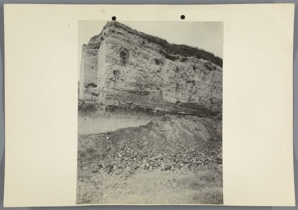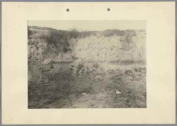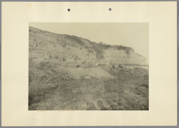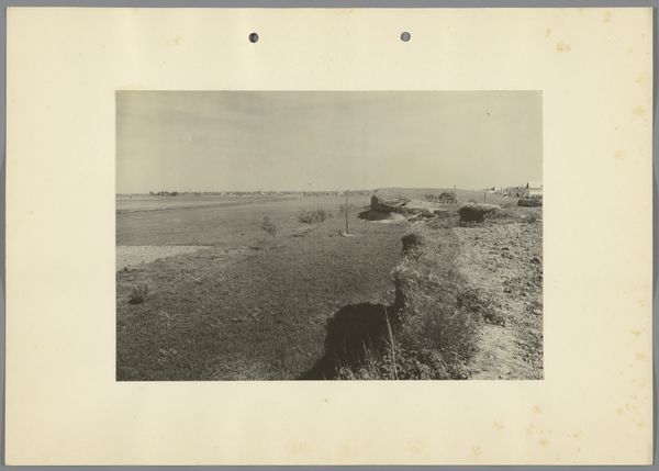 Curator: My first impression is of an old photograph bleached by time; the limited palette makes me feel rather nostalgic. Editor: Indeed. We're looking at "Zijaanzicht van een terp bij Tószeg," or "Side view of a mound near Tószeg" created in 1928 by Jan Lanting. What intrigues me most is the use of watercolor on paper. The process speaks volumes about landscape representation in art, connecting to traditions of plein air sketching and its place in both artistic training and documentation of specific places. Curator: You are absolutely right. Considering the location, one imagines Lanting confronting the actual mound directly, observing how the earth is formed. It’s fascinating to imagine the societal backdrop, considering that in 1928 the artist was closely following how ordinary labor can be a special element within our modern age. Editor: Absolutely. Tószeg has archaeological significance, known for Bronze Age settlements. One wonders if Lanting was aware of these findings. His depiction could be interpreted as a reflection on the weight of history embedded in the land. The mound thus becomes more than a mere landscape feature, more than the means of obtaining water to the settlement in the area. Curator: Good point, one might observe Lanting focusing on the texture of the paper itself. The visual weight seems divided between paper as material versus the mound as an archeological site and physical barrier; what kind of process, one could wonder, caused it to turn almost monochromatic? Editor: That is quite an observation; I'm now viewing this through the lens of institutional validation. Sketchbooks and watercolors were accepted differently from paintings—did it grant the artist some freedoms regarding subject and expression outside formal artistic expectations of his time? This image certainly tests that very limit by pushing against preconceived landscape representations and embracing the artistic vision that drove the age. Curator: Exactly, you bring up the real substance beneath. A dialogue about what’s real! Editor: Indeed, I now see it’s less about capturing a pretty scene and more about documenting a place charged with the weight of labor, history, and culture. Thank you for these stimulating questions!