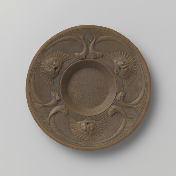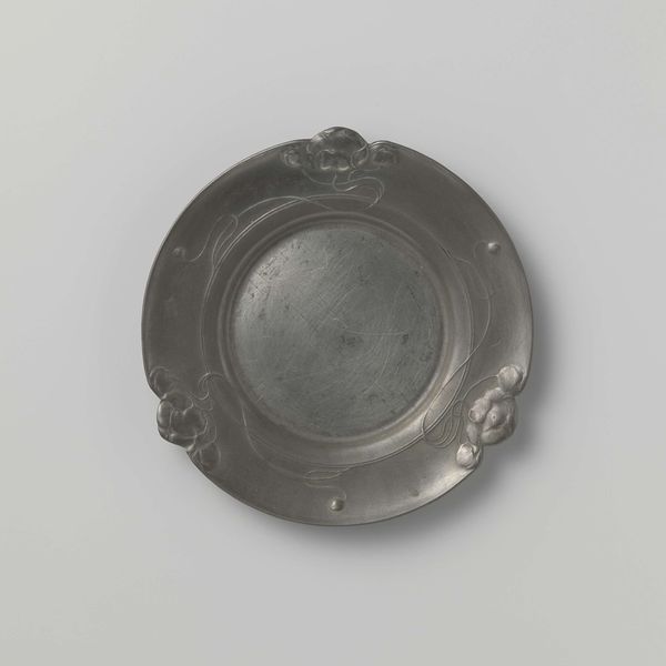 This tin plate, made by Hans Zatzer, presents a fascinating study in circular forms and decorative layering. The concentric bands draw the eye inward, from the detailed patterns of vines, insects, and birds at the outer edges to the smooth, undecorated center. Zatzer’s design achieves a delicate balance between ornamentation and functionality. The intricate motifs, rendered with a precise hand, are segmented into discrete registers around the plate. This careful organization speaks to a broader artistic interest in structure and order. The interplay between the engraved details and the plain surfaces highlights the material qualities of the tin. While the overall effect is decorative, the underlying structure emphasizes the plate's form. Consider how the circular composition invites us to contemplate ideas of wholeness and containment. It’s a reminder that even everyday objects can embody complex artistic and cultural meanings, inviting ongoing interpretation.