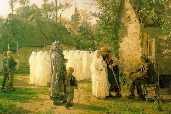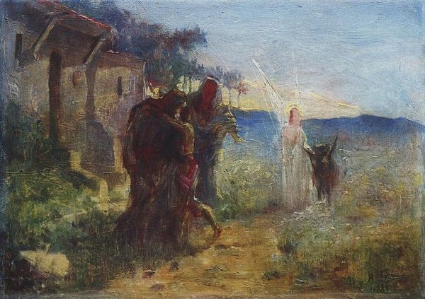 Mikhail Nesterov's "Wayfarer" is a painting where muted greens and blues blend, softening the edges of this encounter, hinting at something between dream and reality. Look at how Nesterov builds the forms, the way he layers thin washes of color, creating a luminous quality, especially in the sky and the open field. It's almost as if the light itself is a character, a silent witness to the meeting of these figures. Notice the texture, or lack of it. The paint is applied so smoothly, so thinly, that it almost disappears, leaving behind only the image. This smoothness adds to the painting's ethereal quality, making it feel like a memory or a vision. And the figures! The wayfarer's hand gently rests on the boy's shoulder, a gesture of guidance or perhaps of farewell. It reminds me of early Pre-Raphaelite paintings. It's about ambiguity, leaving room for your own story.
