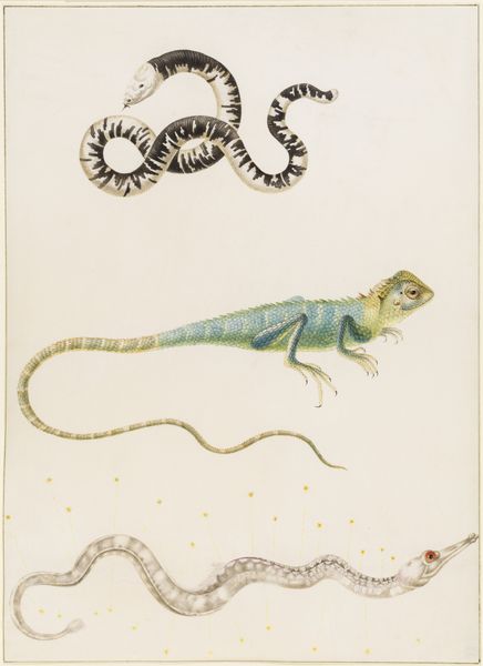 Editor: So, here we have Joris Hoefnagel’s "Plate 52: Two Sand Lizards" from around 1575 to 1580, using ink and watercolor. They’re nestled in this circular frame... It’s funny, they look like they’re posing for a portrait! What do you make of this piece? Curator: Oh, absolutely posing! It's a Renaissance "selfie" in a way, isn't it? These natural history illustrations were all the rage. Forget Instagram, they had painstakingly rendered watercolors. Hoefnagel, bless his curious heart, wasn't just copying; he was creating a pocket-sized encyclopedia of the world, as he saw it. Each one teeming with observations. Editor: A pocket encyclopedia, I love that! What about the lizards themselves? Anything special there? Curator: They are gloriously observed! The textures, the colours…and those latin scribbles tell their own tale. This isn't just science; it’s art masquerading as science, or is it science doing its best to mimic art? I'm tickled by this blending, always. Don't you think there is a playfulness that elevates this beyond just a study? Editor: Definitely. The artist's curiosity comes through, and the attention to detail. So, what’s the story with the oval frame around them? Curator: Consider that circle a little lens focusing our gaze. Hoefnagel isn't just showing us lizards; he is presenting specimens carefully captured and examined and a metaphor to his personal view on the world . This piece whispers of stories of exploration. Of artists itching to capture every detail of a vibrant, expanding world. A reflection, almost, of how someone views their immediate and larger world around them. Editor: Wow, I never thought of it that way. It’s so much more than just a picture of lizards! Curator: Exactly! And isn't it delicious when art pulls you in unexpected directions?