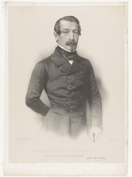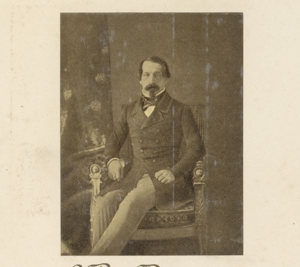 Curator: Look at that formidable mustache! This daguerreotype, crafted by Gustave Le Gray in 1852, captures Louis-Napoléon Bonaparte as Prince-Président. Editor: Yes, formidable is the right word. There's something almost intimidating about the gaze, despite the formality. It radiates authority, even a touch of self-importance, which seems very much the tone of the era. Curator: Exactly. Consider the chair, the composition: Everything emphasizes Bonaparte's stature, subtly connecting him to ideas of power. Note how the slight blur suggests movement, adding to his dynamism and presence, or perhaps a slight unease. Editor: Interesting observation. And how do we reconcile that slight blur with the medium of the daguerreotype itself, which was known for its sharp detail? This work must have required skill and perhaps innovation to create this romantic image of the sitter. Curator: Indeed. But beyond technical aspects, portraiture from the 19th Century always fascinates me, acting as a reflection of deeper cultural ideals. Photography helped in disseminating an image, enabling the wider circulation of Bonaparte’s identity in a world undergoing immense shifts in power and class. Editor: Absolutely. We must remember who this image was for. Beyond its artistic merit, it's crucial to see this piece within its historical and political context. Bonaparte's carefully constructed persona – a bridge between monarchy and modernity – was a form of calculated political messaging that normalized him within these different roles. Curator: The composition almost borrows from Romantic portraiture, doesn’t it? But instead of untamed nature, it’s a political theater where Bonaparte assumes a carefully staged pose of power. His stern expression mirrors the turbulent years and also acts to assert control. Editor: Precisely. He is positioned as the answer to that turmoil, offering a vision of stable leadership, which in hindsight, is undeniably self-serving. Images, like this one, can act as propaganda and this makes one realize their cultural importance beyond aesthetics. Curator: It definitely reveals the fascinating dialogue between Romantic ideals, burgeoning photographic techniques, and the potent forces of politics. I find it all extremely potent! Editor: I completely agree. Reflecting on how a single image can encapsulate such complexity is why I find examining visual materials so valuable. Thank you!