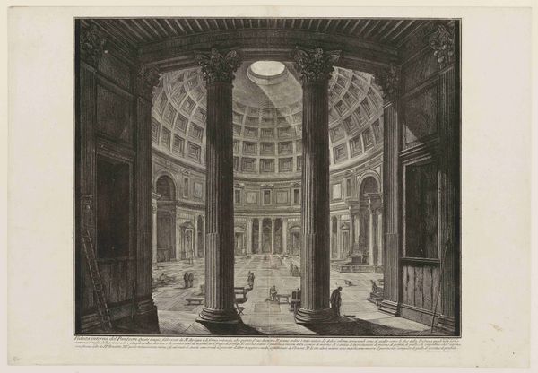 Editor: So, this is Giovanni Battista Piranesi’s "Interior view of the Pronaos of the Pantheon," an engraving from 1769. It's really impressive how he captures the sheer scale of the architecture using just lines and shadows. I'm immediately struck by the contrast between the massive columns and the tiny figures below. What aspects of its visual composition stand out to you? Curator: The strategic use of light and shadow to articulate the architecture is, indeed, paramount. Notice how the sharply defined light, raking across the columns, not only emphasizes their volume but also dissects the space into distinct planes. Piranesi masterfully uses the intaglio medium to create gradations in tone that articulate depth and dimension. What does the contrast of light and dark contribute to the image, aesthetically? Editor: I see it adds drama, and really highlights the contrast in texture and mass between the columns and the walls, directing my eye through the space, doesn't it? Curator: Precisely. This manipulation guides the gaze, but more significantly, it imposes a visual hierarchy. Observe the proportional relationships between the architectural elements, and then to the human figures, scattered rather uniformly through the space. Does this suggest anything about the symbolic intent? Editor: Hmmm... maybe it emphasizes the power of Roman architecture and reduces the importance of the people within it. The building becomes the main subject, not the people. Curator: Precisely. Consider too, the calculated geometry inherent in the composition - the regimented order of the columns against the vast, receding space. This reinforces a theme common during the period - neoclassicism. Editor: I never thought of it that way. I focused so much on the architecture that I overlooked its systematic composition. I learned that a lot can be gained by analyzing internal components, not only subject matter. Thanks! Curator: The devil, as they say, is in the details. Examining the intrinsic qualities provides an insightful methodology for further art viewing experiences.