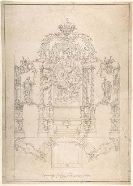 Firma Feuchère created this drawing of a "Vuurbok," or fire dog, with graphite. The intricate design evokes the opulence and decorative arts of a bygone era, likely intended for a wealthy client. Historically, fire dogs were functional objects to hold wood in a fireplace, but they also became potent symbols of status. The grotesque figures and elaborate ornamentation point to the complex dynamics of power and display within aristocratic households. By incorporating mythological beasts and ornate flourishes, the artist seems to both embrace traditional representations of wealth while also developing a unique narrative, one where domesticity and the mythical intersect. Consider how the fire dog, a traditionally masculine object, is here infused with the delicacy of the decorative arts, perhaps challenging conventional gender roles of the period. This design resonates as a cultural artifact, reflecting how societal values and personal expression can converge in the most unexpected of places.