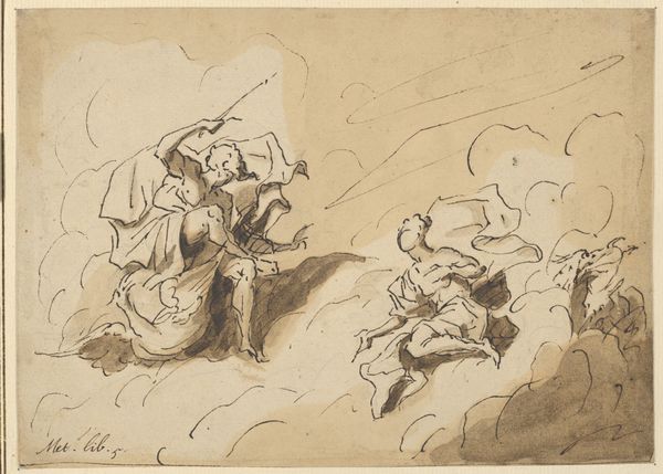 Editor: This is "Study for 'The Defeat of the Floating Batteries at Gibraltar,'" a pen and ink drawing by John Singleton Copley, created sometime between 1783 and 1786. It's quite energetic, a mass of figures caught in a chaotic scene. I am struck by how Copley captured the dynamism of a moment in conflict. What do you see in this work? Curator: As a study, it provides a direct insight into Copley's working process. Look at the materials: pen and ink, readily available and inexpensive, allowed for immediate exploration. These sketches weren't precious objects, but tools for figuring out the final painting. Consider also the labour involved – Copley painstakingly mapped out figures and composition through repetitive marks. Editor: So you're saying the value isn’t in the finished piece but in the labor involved? Curator: Exactly! And what the process reveals. Here, the swift lines betray the urgency of war, the sheer number of figures implies a society caught up in conflict. This drawing then, moves away from a focus on individual genius to examine a moment in history seen through material availability and artistic toil. How does this emphasis change your perspective? Editor: It's interesting to think about it as a document of artistic labor and societal involvement rather than just an aesthetically pleasing artwork. Curator: Precisely. We begin to question traditional hierarchies that elevate finished oil paintings over preparatory drawings. The immediacy and raw quality of this study offers a different kind of value, speaking directly to the circumstances of its creation. Editor: I hadn't considered that the drawing itself could be a reflection of the social conditions surrounding its making. Thank you, it gives a lot to consider! Curator: Indeed. Examining the 'how' and 'why' of its creation always offers invaluable insights.