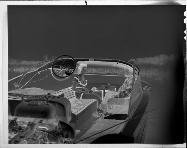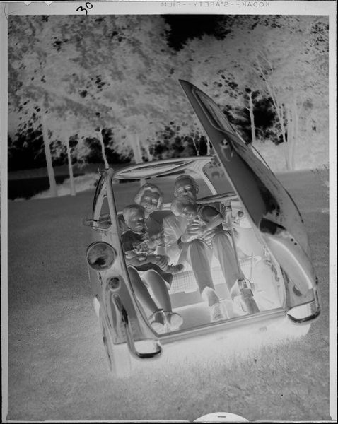 Curator: Here, we have an intriguing untitled photograph, "old wrecked car," by Lucian and Mary Brown. Editor: Well, my first thought is that it's an elegy—for industry, for a certain kind of masculine freedom promised by the open road. The inverted tones amplify that feeling of loss. Curator: The photographic negative almost feels like an x-ray, exposing the vulnerability beneath the car's form, a poignant reminder of mortality. Consider the cultural symbolism of the automobile. Editor: Exactly, cars became symbols of progress and personal liberty, especially for the working class. This wreck speaks to broken promises, planned obsolescence, and ultimately, a critique of consumer culture. Curator: Yes, and I see the enduring human fascination with ruins—structures that echo past ambitions and fallen empires. There's an inherent beauty even in decay. Editor: Ultimately, it is a stark reflection on the costs associated with our relentless pursuit of progress and its impact on the environment. Curator: It certainly compels us to contemplate the narratives embedded in the objects we often overlook. Editor: Yes, revealing how artifacts of everyday life encode complex histories.