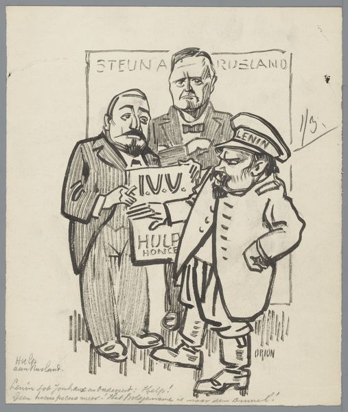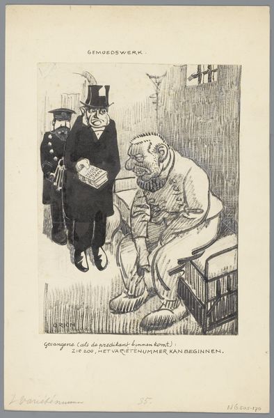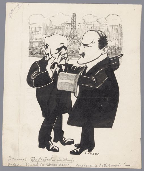 Editor: This drawing by Albert Hahn, titled "Ontwerp voor een politieke spotprent: De Schnabel," made sometime between 1887 and 1918, uses pen and watercolor, I think? The looming figure certainly sets an ominous tone... I'm curious, what symbols or cultural references jump out at you? Curator: The imposing figure holding what appears to be a grand building dwarfs the town below. This is no accident. Note the title, "De Schnabel"–the beak. Who do you suppose the artist intended to portray? The unflattering features... Editor: A politician? Someone in power, maybe exploiting the little guy? Curator: Precisely. And what of the building? It has "Grand Bazar de Labour" written across the façade. Editor: Grand Bazaar of Labor? Almost like he’s displaying it. Is he the architect, perhaps? Or someone profiting *from* labor? Curator: Consider the period. The rise of industry, burgeoning capitalism, socialist critique... Hahn, known for his sharp political cartoons, uses visual language deeply rooted in those anxieties. Notice how the "Grand Bazaar" building looks very new and uniform, but the city buildings look quite unstable. Do you think this contrast communicates a clear message? Editor: Absolutely, it shows this imbalance, doesn't it? The small buildings even seem like they’re being crushed by the Bazar, and by extension, the large man. I'll certainly remember that symbolism. Thanks! Curator: Indeed. It’s a powerful commentary on unchecked power, isn't it? These kinds of symbols resonate through time.