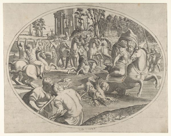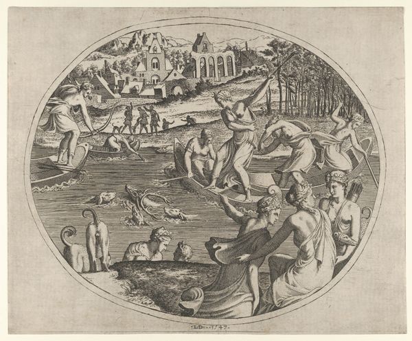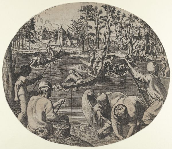 Léon Davent made this print, "Fishing Scene," sometime in the mid-16th century. It's an etching, which means the artist used a sharp needle to draw into a wax-coated metal plate. The plate was then submerged in acid, which bit into the exposed lines. Ink was applied, and the plate was pressed onto paper. The act of etching allows for incredible detail, as you can see in the intricate depiction of the figures and the landscape. The labor-intensive process mirrors the labor of the fishermen depicted. They’re shown working together, using nets and lines to haul in their catch, suggesting a communal effort deeply connected to their environment. The image shows not just the act of fishing but also the social context of the activity. This print invites us to consider the relationship between the physical work of the artist and the physical work of the people they depict, reminding us that art-making is also a form of labor, deeply intertwined with the social and economic realities of its time.