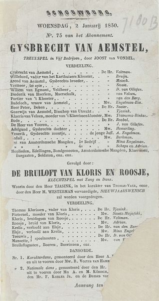 This is a program for a performance of "Gijsbrecht van Aemstel," by Joost van Vondel, performed in Amsterdam in 1860. The names listed here, such as Gijsbrecht, Adelgund, and Rafael, are more than mere characters; they are symbols imbued with cultural memory. Consider Gijsbrecht, the central figure: his name resonates with bravery and leadership, traits that have been celebrated across centuries in different cultures. We see echoes of such heroic figures in ancient Greek tragedies, where protagonists face moral dilemmas. The concept of the tragic hero is not static; it evolves, shifting in meaning, from the classical ideal to modern interpretations of flawed but noble characters. The emotional weight of these characters and narratives engages viewers on a deep, subconscious level, and the cyclical progression of such archetypes resurfaces, evolves, and takes on new meanings in different historical contexts, reflecting our collective psyche.