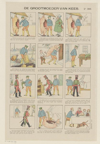 This is a hand-colored print, likely from the 19th century, by P.C.L. van Staden Czn., titled "Als 't in de wereld goed zal gaan." The material here isn’t precious; it’s cheap paper and ink, made for mass consumption. The imagery, however, tells us a great deal about social relations. The print is divided into a grid of vignettes, each illustrating a scene of domestic life. We see figures engaged in various activities: working, cleaning, and caring for children. But look closer, and you'll notice a clear division of labor. Men are shown working outside the home, while women are confined to domestic duties. The rough, almost folksy quality of the print reinforces the message: this is an image intended for a broad audience, not the elite. The print underscores how deeply ingrained social roles were and, of course, the labor involved in maintaining the household. Ultimately, it serves as a reminder that what we often consider “high art” exists alongside a much wider world of visual culture, deeply embedded in the everyday lives of ordinary people.