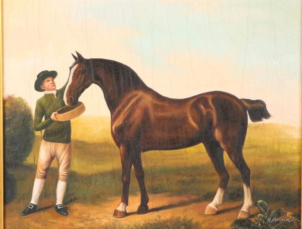 Editor: Here we have Franz Xaver Winterhalter's "Equestrian Portrait of François Adolphe Akermann," created around 1870 using oil paint. I find the subdued palette quite striking; it evokes a sense of calm and perhaps even understated authority. What stands out to you compositionally? Curator: Immediately, the tonal gradation establishes a clear hierarchy. Note how Winterhalter uses a restricted range of earth tones, punctuated by the glints of light on the horse's coat and Akermann’s slightly illuminated face. This directs our gaze through calculated focal points within the composition. Observe the diagonal created by the horse's body, its line reinforced by Akermann’s posture, bisecting the canvas and generating a dynamic tension against the static background. What purpose does this tension achieve, do you think? Editor: Perhaps to bring the viewer's eye towards the portrait? What can you tell me about that background? Curator: Precisely. The background, loosely defined, serves merely as a foil. Its lack of detail and hazy atmospheric perspective ensures that Akermann and his horse remain the primary subjects, devoid of distractions. However, it is crucial in establishing depth. Consider how the values shift as we move further back in space, creating an illusion of recession and thus anchoring the equestrian figure firmly within a three-dimensional plane. The background lacks clarity and clear color distinction which ultimately leads to greater emphasis of the subjects of the portrait. Editor: That’s fascinating. I had initially seen it as merely background scenery, but I understand the importance to create a coherent overall design. I now notice how it functions in relation to the foreground elements. Thanks! Curator: Indeed. Focusing on formal elements unveils the considered compositional choices underpinning even seemingly straightforward portraiture.