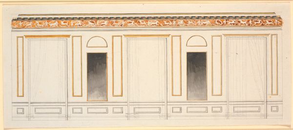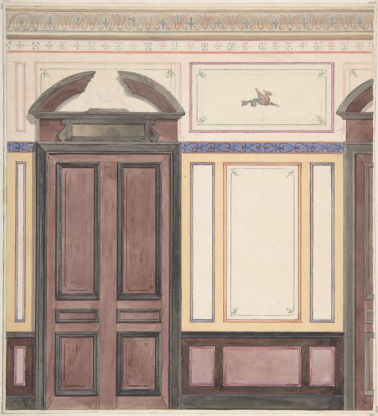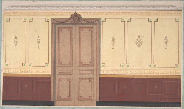 Jules-Edmond-Charles Lachaise created this design for painted wall paneling at Deepdene, in Dorking, Surrey, using watercolor, graphite, and pen and ink. The Deepdene estate, owned by the Hope family, was known for its extensive art collection and lavish interiors, embodying the wealth and status of the British aristocracy. Lachaise's design reflects this social milieu, showcasing an idealized vision of domesticity and taste. The paneling, with its muted colors and classical motifs, evokes a sense of refined elegance and order. Yet, the careful arrangement and subtle ornamentation also speak to the ways in which identity and social roles were constructed through interior design. Consider how the layout of a room can dictate interactions, shaping gendered and classed expectations within the domestic sphere. The aesthetic choices, while seemingly innocuous, reinforce specific social hierarchies and cultural values, inviting us to reflect on the power dynamics inherent in the spaces we inhabit.