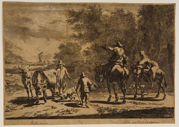 This print, Resting Hunting Party, was made by an anonymous artist using etching. It presents us with an intriguing glimpse into social life, likely somewhere in 17th or 18th century Europe. The image is a snapshot of leisure, portraying a well-to-do group pausing during a hunt. Note the figures on horseback, the fashionable hats, and the dogs—all visual codes indicating wealth and status. What I find compelling is the potential commentary on social hierarchies. Is the artist celebrating the aristocracy's pastimes, or subtly critiquing their detachment from the lives of the common folk? To fully understand this work, we'd need to delve into the period's social history. Researching hunting practices, fashion trends, and class relations would give us a richer context. Art history, after all, isn't just about aesthetics, it's about understanding the conversations art has with its own time.