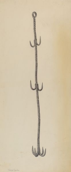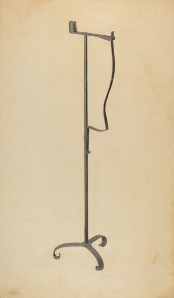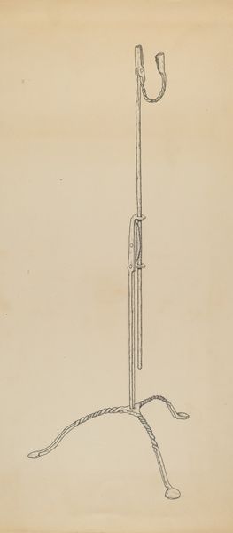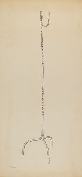 Irene Lawson made this drawing of a "Rush and Candle Stand" using graphite on paper. At first glance, the composition is dominated by a simple, elegant verticality. The stand rises assertively from its tripod base to its terminal point, creating a sense of functional grace. Lawson's choice of graphite is crucial here; the medium allows for subtle gradations of tone, giving form to the object while maintaining a certain distance. The candle stand is depicted not merely as an object, but as a structure, a play of lines and volumes in space. The curvature of the arms holding the candles provides a dynamic counterpoint to the straight lines of the stand itself. This juxtaposition introduces a certain tension, a visual dialogue between the organic and the geometric. The seemingly straightforward representation is actually a carefully constructed study in contrasts. Consider how Lawson uses the limitations of her materials to create something more than a mere representation. The drawing engages in a larger discourse about form, function, and representation.