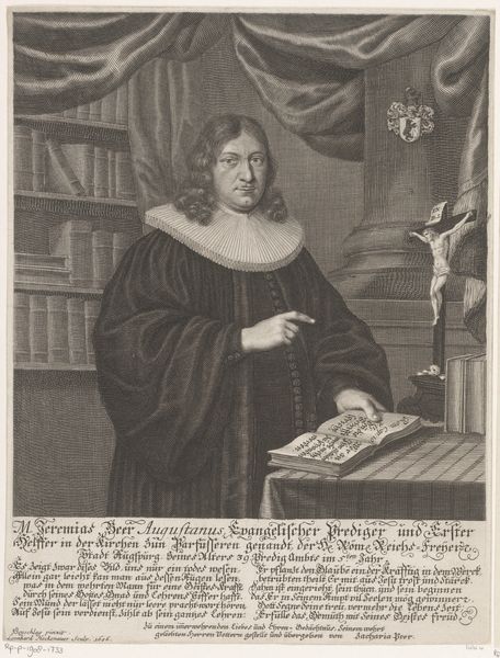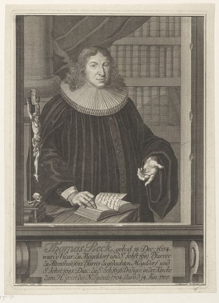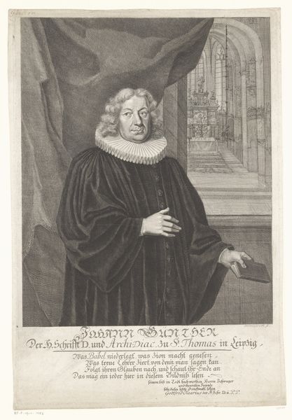 Leonhard Heckenauer made this portrait of Johann Georg Mertz at age 38, using engraving, sometime around 1670. Engraving is a meticulous printmaking process, where the artist carefully cuts lines into a metal plate. Ink is then applied to the incised lines, and the plate is pressed onto paper. The fineness of the lines here speaks to Heckenauer's mastery of the technique. The image is built up from many tiny marks, a huge amount of skilled work which creates subtle tones and textures. Look closely, and you can see how the quality of the lines defines the textures of skin, hair, and fabric. In this portrait, the material of the print itself signifies value. The printmaking process allowed for wider distribution of images, and a degree of celebrity, but it was still an expensive medium. As such, the artwork underscores Mertz’s status as a man of learning and importance, and a member of the European elite. Considered in this light, the artwork challenges assumptions about the division between fine art and more ‘humble’ graphic techniques.