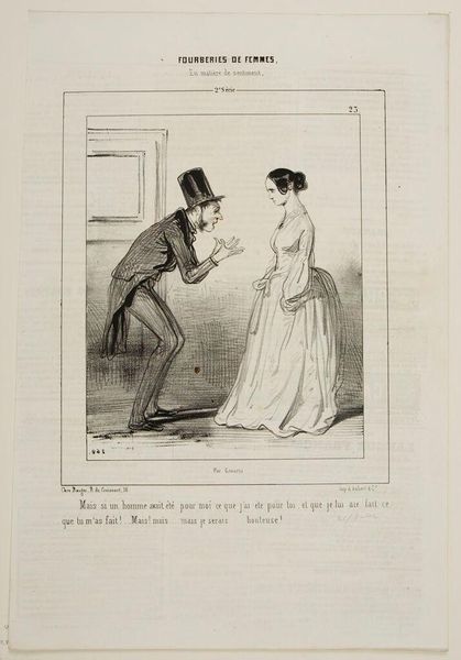 Curator: Here we have Paul Gavarni's lithograph, "Thank you, sir, I don't dance . . .". Gavarni, born in 1804, was a key figure in depicting Parisian life. Editor: Oh, this has got wit baked right into it! The body language is so telling. She looks like she's melting into the door. Curator: Precisely, the refusal, the societal constraints, the performance of gender expectations, even within a carnival setting... it's all there, subtly critiqued. Editor: I wonder what story she's telling herself to get through this. Did someone spill wine on her dress? Maybe she's just tired, like me after a good jig! Curator: Gavarni often used his art to comment on the social and political issues of his time. He touches upon the performative aspects of societal expectations. Editor: Hmm, yes, a silent scream in a dress of ruffles and lace! That awkwardness—I feel that! Curator: And that makes Gavarni's work so enduring. Editor: Art for the ages! I want this lithograph to tell me a secret.