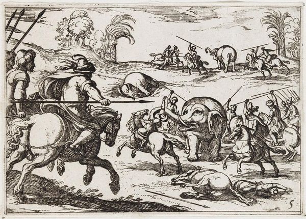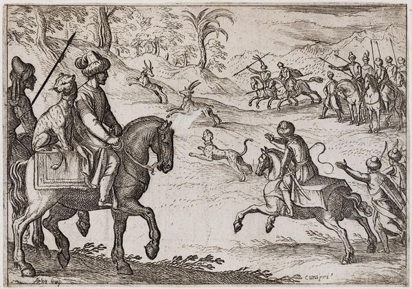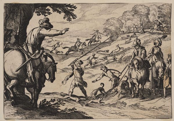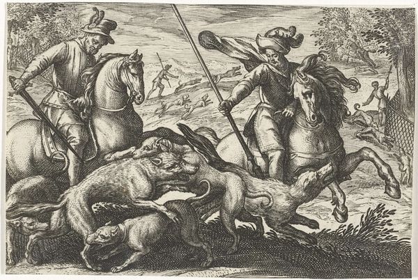 Editor: This is Egbert Jansz's "Landscape with a Boar Hunt," an engraving from 1598. There’s so much energy packed into this relatively small print! It really pulls you into the thrill of the hunt, even if it feels a little… staged. What do you make of the composition and its historical context? Curator: It's interesting that you pick up on the staged quality. Prints like these, especially hunting scenes, played a significant role in shaping perceptions of aristocratic life. How do you think the depiction of the hunt in this artwork may speak to socio-political hierarchies? Editor: Well, hunting was a pastime of the wealthy, wasn't it? So depicting it in such detail, almost glorifying the danger, could reinforce the power and status of the elite. It's like saying, "Look at what they can do!" Curator: Precisely! These images served as visual propaganda, legitimizing the aristocracy's dominance. But beyond that, let's consider the intended audience. These prints weren’t just for the upper class. Who else do you think was viewing this, and what meanings could it convey? Editor: I guess the burgeoning merchant class? Maybe they wanted a piece of that aristocratic lifestyle, or at least, the idea of it. This print would give them something tangible to aspire to, and perhaps reflect a bit of glory back on themselves. Curator: Exactly! Prints democratized imagery and spread specific ideas to a wide audience. Even seemingly straightforward scenes, like this hunt, participated in a larger conversation about class, power, and the public image of leadership. And considering this, can you view the presented scene now from a fresh angle? Editor: Absolutely. It makes you consider the intent behind even seemingly simple images. Thanks, that gives me a lot to think about. Curator: My pleasure. These layered perspectives is the beauty of viewing the world around us through the lense of art.