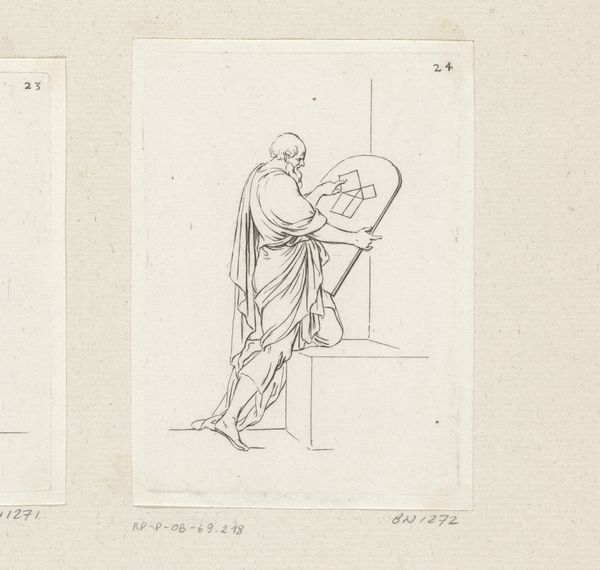 Editor: So, this is "Man op de rug gezien met dienblad en karaf," by Sébastien Leclerc I, created in 1706. It's a pen drawing, and I find it fascinating how such simple materials can depict this servant so elegantly. What stands out to you about this work? Curator: I'm immediately drawn to the labor inherent in this image. We see the man's posture, the strain of carrying the tray. Consider the material conditions of the Baroque period – who were these servants? What were their lives like? This drawing becomes a document, in a way, of class and consumption. The delicate lines of the pen, the relatively cheap material, contrast starkly with the opulence he's serving. Don't you find that striking? Editor: Absolutely. The fact that the artist chose pen and ink, readily available materials, to depict a scene of luxury, it does create a powerful contrast. I hadn't thought about it in terms of documenting class. Curator: And think about the karaf and dienblad themselves – these weren't mass-produced items. Skilled artisans crafted them. The drawing acknowledges not just the server's labor, but the labor involved in creating the objects he carries, implying complex systems of material production and consumption. Editor: So, by examining the materials and the depiction of labor, we're getting a glimpse into the social and economic structure of the time. It’s more than just a portrait; it’s a commentary. Curator: Precisely! The choice of medium, the subject matter, all speak volumes about the societal values and material realities of the Baroque era. Editor: I’ll definitely look at Baroque art with new eyes. Focusing on the materials really opened up a whole new perspective for me. Curator: Indeed. Considering art through the lens of materiality connects us to the world that created it.