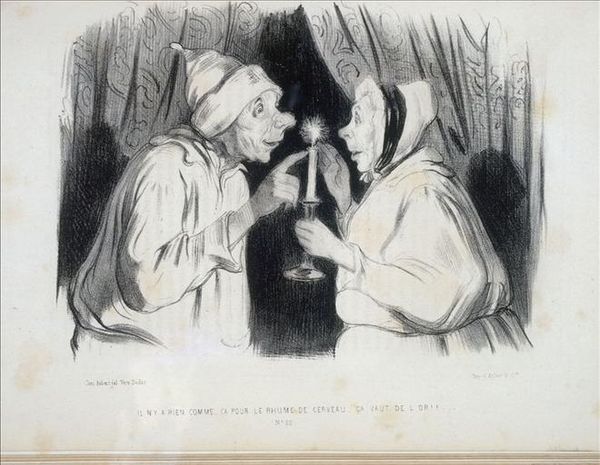 Curator: Honoré Daumier's lithograph, titled "Charades," offers a glimpse into popular entertainment of his time. The print is part of the collection at the Harvard Art Museums. Editor: It’s immediately striking! The expressions are so exaggerated and rendered with such immediacy. Are they frightened or just deeply involved in their game? Curator: The production of lithographs like this allowed for mass distribution. Daumier was commenting on and shaping the culture of leisure and entertainment accessible to a broader public. Editor: The single candle flame becomes a potent symbol, doesn't it? It’s a beacon in the darkness and represents the spark of imagination fueling their guessing game. I wonder what secrets the shadows conceal. Curator: And note the economy of line! Daumier's quick, almost crude strokes belie his mastery of the medium and speak to the demands of churning out work for publication. Editor: It’s that very roughness that makes the piece feel so alive and human. It allows us, even now, to connect with the expressions of the figures. Curator: Absolutely. It is a great demonstration of how art functions within specific economic and social conditions. Editor: It is also an intriguing glimpse into the human need for storytelling and shared experience. I will think about Daumier's cultural references next time I play charades.