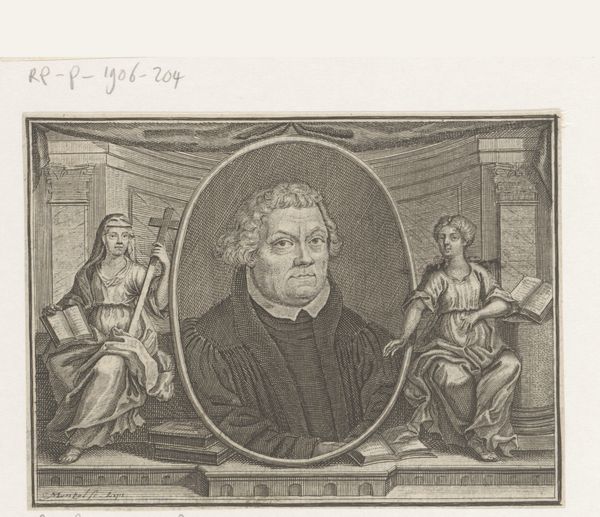 Curator: Today, we're looking at a 1668 engraving by Johann Caspar Hoeckner, titled "Portret van Martin Geier op 54-jarige leeftijd en vier verbeelde psalmen," currently held at the Rijksmuseum. Editor: My initial impression is one of complexity. The stark contrasts typical of engraving, combined with the density of symbolic elements, creates a rather intense visual experience. Curator: The composition is divided. On the left, we have the portrait of Martin Geier himself, framed within an elaborate oval. Note the meticulous detail in rendering his features, the texture of his garments. And the flanking imagery of the skull and cross—typical vanitas. Editor: Right. But observe how the engraving itself necessitates a particular working method. The labour involved in producing those fine lines—the physicality of the process—resonates. It's not just about representation; it's about the tangible effort embedded within the matrix, literally pressed upon the paper. Curator: Absolutely, the technique is integral to understanding the piece, informing our perception. And if we turn our attention to the right, we see four scenes illustrating psalms of David. Editor: It’s interesting that Hoeckner embeds another image of a printing press into these biblical narratives. It draws connections between textual production and artistic process, showing the craft involved in disseminating not only holy scriptures, but also art and thought. It serves as a clear, visual reminder of material origins and social impact. Curator: Indeed. It’s as if Hoeckner is deliberately conflating the spiritual with the scholarly and the act of creation, presenting us with multiple layers of meaning. One must decode each symbol, and assess its purpose in conjunction with those around it. Editor: I find the stark juxtaposition between the individual portrait and these visual renderings particularly thought-provoking. It makes me consider print production beyond mere aesthetic appreciation, instead asking fundamental questions of purpose and reception within 17th-century networks of knowledge. Curator: A most valuable insight. I trust listeners have now been equipped to decode Hoeckner’s symbolic portrait with renewed engagement. Editor: A renewed and informed appreciation for what images make possible.