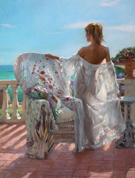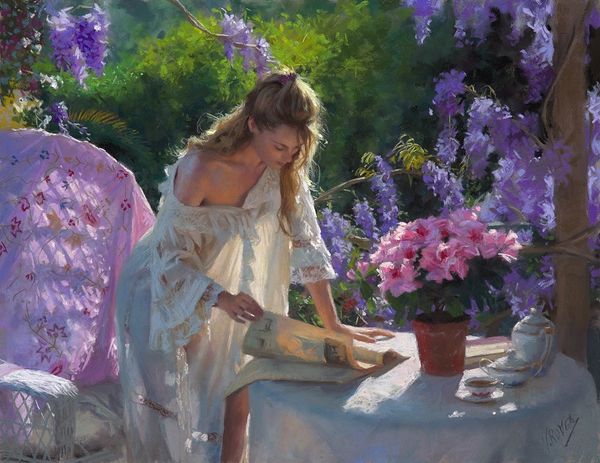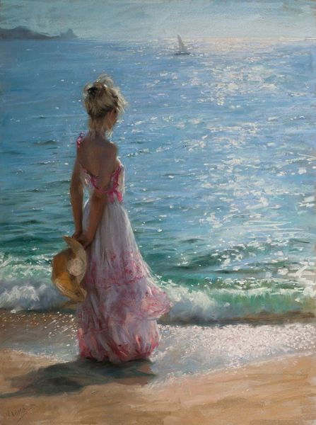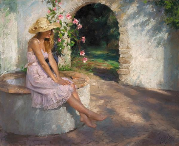 Art Historian: Editor: So, here we have "Basking Beauty" by Vicente Romero. It looks like it’s oil paint, maybe even gouache, and the artist clearly worked en plein air. It's got this very dreamy, romantic feel to it... What catches your eye in this piece? Art Historian: Well, beyond the immediate impression of beauty, I'm interested in what this image tells us about idealized femininity. The woman is presented in a state of serene contemplation, removed from labor or direct engagement with the world. Consider the history of depicting women in art. Editor: You mean like, how women have often been passive subjects, seen but not necessarily heard or active? Art Historian: Exactly! The flowing dress, the averted gaze – these are familiar tropes. But how do they function in our contemporary context? Does the artist reinforce these tropes, or is there a subtle commentary happening here? Perhaps even a reclaiming of that classic form of the female portrait by today's standards? What kind of power is inherent in capturing this moment? Editor: Hmm, that's a good point. I guess I was mostly seeing the beauty and the light, and didn't immediately think about it within that broader conversation around representation and social role of women. So what makes this art different? The context we bring to it? Art Historian: Precisely. We engage in constant dialogue, between historical precedents and current cultural values. Analyzing how the artist handles composition, use of light and even choice of subject matter in terms of the broader narratives in art is always critical. Understanding what that choice of representation conveys. It might change how one may react to a piece like this. Editor: Okay, I’m starting to see how looking through a different lens can open up a whole new conversation. Thank you for that observation! Art Historian: My pleasure. Remember art history is never just about the past, it’s a continuous reflection of our present values.