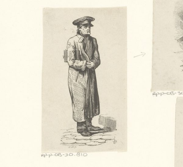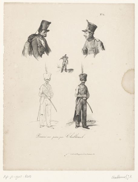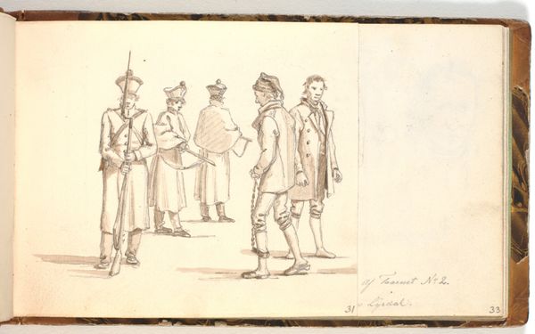 Curator: We’re looking at “Militairen met een trommel en blaasinstrumenten,” or “Soldiers with a Drum and Wind Instruments,” a drawing by Jan Hoynck van Papendrecht dating back to before 1889. It's ink on paper and displays three figures in military dress. My initial impression is one of detailed observation and restrained energy. Editor: It’s interesting how Papendrecht focuses on rendering the specific qualities of the uniforms— the fabric, the buttons, and how they fall on the body. Curator: Yes, but look closer, isn't the work primarily about documentation? The artist meticulously recorded these men in their work attire and weaponry for reasons we can only surmise. The work reminds us of military presence and perhaps alludes to how these individuals operated in a time of considerable conflict, given their formal uniforms. Editor: But there’s an artistry beyond simple record-keeping, isn't there? Observe how he plays with line weight. In the figure on the right, for instance, those densely packed lines create a stark contrast. It’s more than just representation; it's manipulation of form to create an impactful visual experience. The composition directs the eye. Curator: I would venture it's more that Papendrecht seems keen to preserve not only the uniforms' precise construction, as you've alluded, but what those uniforms stood for socially, which speaks to this historical fashion. Also the role of the musicians themselves, who perhaps represent celebration but also potentially represent mobilization for war. Editor: Do you feel the work suffers by being a preparatory drawing and nothing more, as far as we know? Are these figures less impactful as components than had they been scaled into a final piece? Curator: I'd argue its preparatory status is precisely where the drawing's value rests. We gain access to Papendrecht’s artistic process, revealing how these materials and practices are intertwined with military culture. Editor: True. The raw, unpolished quality does invite us to look past the figures and examine the craftsmanship. Curator: Precisely. In that sense, maybe there is more value to its "unfinishedness." Editor: An insightful suggestion, I’m almost persuaded.