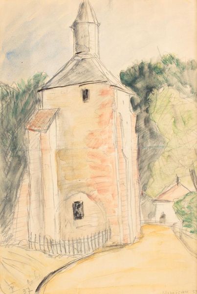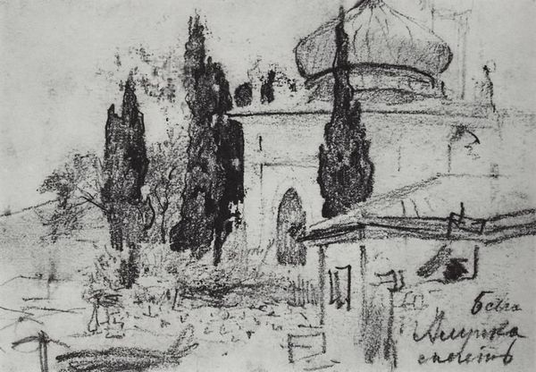 Editor: This painting, entitled "Palestine Study," by Vasily Polenov appears to be an oil painting, perhaps a study for a larger work. The colors are quite striking, particularly the juxtaposition of the muted landscape with the intense blue mountain in the background. How do you interpret this piece in terms of its composition? Curator: Immediately, one notices the strong horizontal division—the light earth tones of the structures and foreground versus the stark violet of the sky and mountains. The dominant tree on the left acts as a vertical counterpoint, anchoring the composition. Consider how the artist uses light and shadow to define form. What effect does this contrast produce? Editor: It seems to give the buildings a solid, almost weighty presence, while the background almost feels ethereal. Curator: Precisely. Observe how Polenov employs subtle variations in color temperature. Cool greens and blues are set against warm yellows and browns. The building, its walls defined by areas of deep shade and striking highlights, become the dominant force here. Note that Polenov does not emphasize details; we see the artist using shape and juxtaposition of tones instead. Editor: So, the details of the place are less important than the artist’s overall impressions? Curator: One might argue that Polenov invites the viewer to examine and analyze how elements interplay, influencing our perception of space and depth. Editor: That makes sense. I was focused on the landscape, but it’s really about how the colors and shapes are arranged. Thanks! Curator: A rewarding experience, wouldn't you agree? Now, every viewing becomes a lesson in structure.