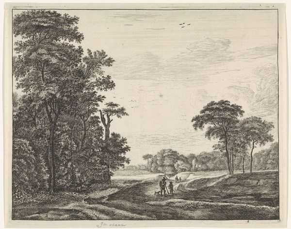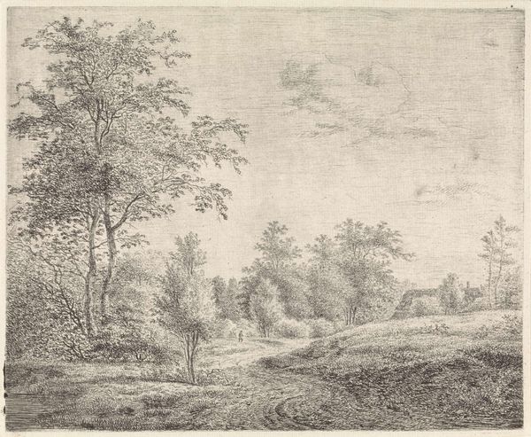 Adrianus Serné’s etching presents us with a path winding through a wooded hill, a solitary figure accompanied by a dog. The trees, with their gnarled branches reaching skyward, evoke the ancient symbol of the Tree of Life, a motif that has appeared across cultures from the Norse Yggdrasil to the biblical Tree of Knowledge. In Serné’s rendering, these trees aren't merely botanical features, but silent witnesses to human passage. This motif of the lone wanderer, akin to Caspar David Friedrich's figures, strikes a deep chord within us. Consider how the image of a tree, once a symbol of fertility and connection to the earth, evolves across art. The image of a path, too, can be seen in myriad contexts, like the spiritual journeys depicted in medieval tapestries. The path that Serné depicts evokes a sense of introspection and the cyclical nature of existence, inviting us to reflect on our own journeys and the echoes of those who have walked before us.