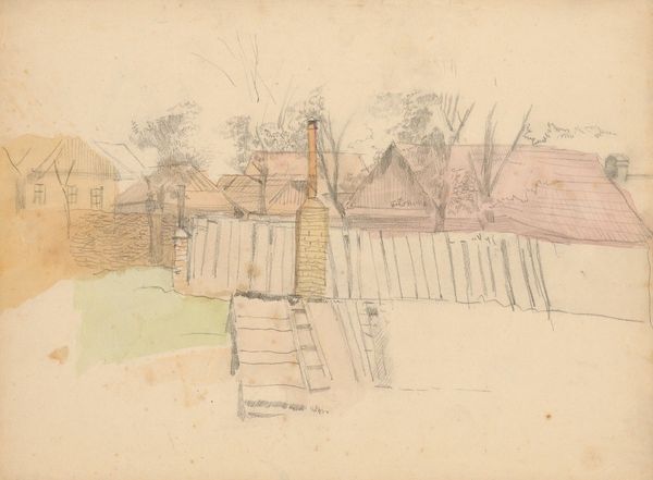 Curator: This is "Sketch of Buildings," a watercolor work by Zygmunt Waliszewski, created sometime between 1930 and 1935. Editor: There’s something haunting about this sketch. It’s so translucent and spare, almost as if the building is fading, or was never really there to begin with. It really has a ghostly, ephemeral feel to it. Curator: Waliszewski, during this period, was deeply embedded in artistic circles that valued experimentation. The way he uses watercolor here—almost like a preliminary gesture—certainly challenges traditional notions of finish and presentation in art. It's less about depicting a concrete structure and more about capturing an essence. Editor: Exactly, and the architectural symbolism contributes to this. Buildings often represent stability, permanence. But here, the wispy lines and washed-out tones give it such a sense of impermanence, like a memory. The windows in particular have a subtle weight and meaning in that sense. Curator: Interesting point. Considering the interwar period and the build-up to the Second World War, we can perhaps view this 'sketch' as a metaphor. The fragility of peace, the impermanence of societal structures... Buildings are bombed or burned down in war, the solidity, as you say, of society fades away with a loss of cultural memory. Editor: That reading absolutely resonates. The use of watercolor only reinforces it further, a medium known for its fluidity, blending and, in some cases, transience. It captures something of the melancholic feeling of that period. Curator: Moreover, think about how the art world, in its institutional structures and art movements, might value these impressions or fragments as testaments to this tension. It seems appropriate this isn’t some grand statement of art and design, but this more subdued watercolor, with less formality, feels intimate and questioning. Editor: I'm drawn to the subtle emotional resonance—like gazing at a half-remembered place from your childhood, the joy but with this profound sadness of inevitable change and loss. Curator: I think you've illuminated aspects of it very clearly; thank you. Seeing how visual imagery of architecture functions on social, cultural, and institutional levels gives it real clarity in terms of time and space. Editor: Likewise, understanding that cultural continuity through visual language is enriching when attempting to place meaning with memory and history.